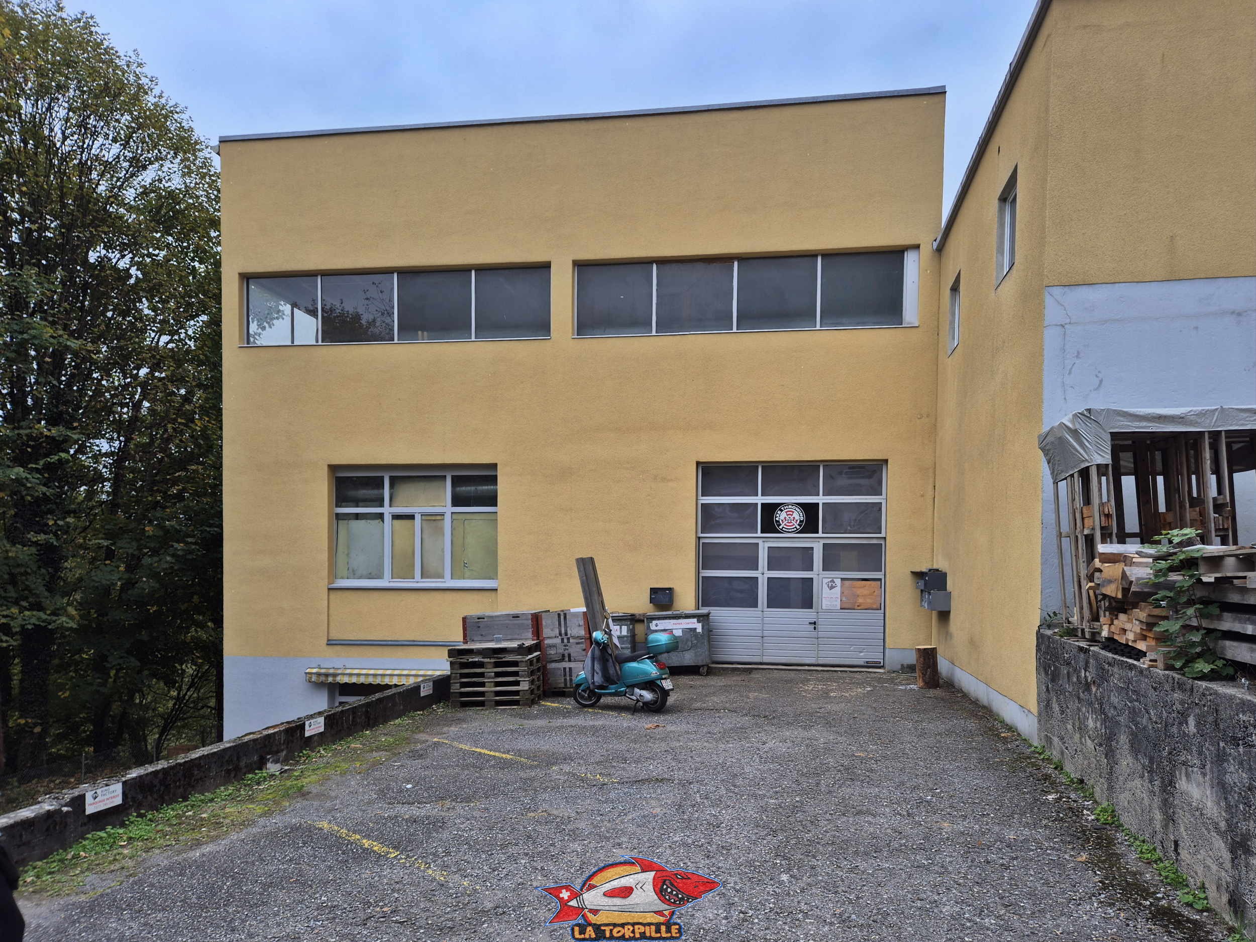 L’extérieur du grand bâtiment qui héberge Axe Throwing Riviera dans la zone industrielle de Fenil.