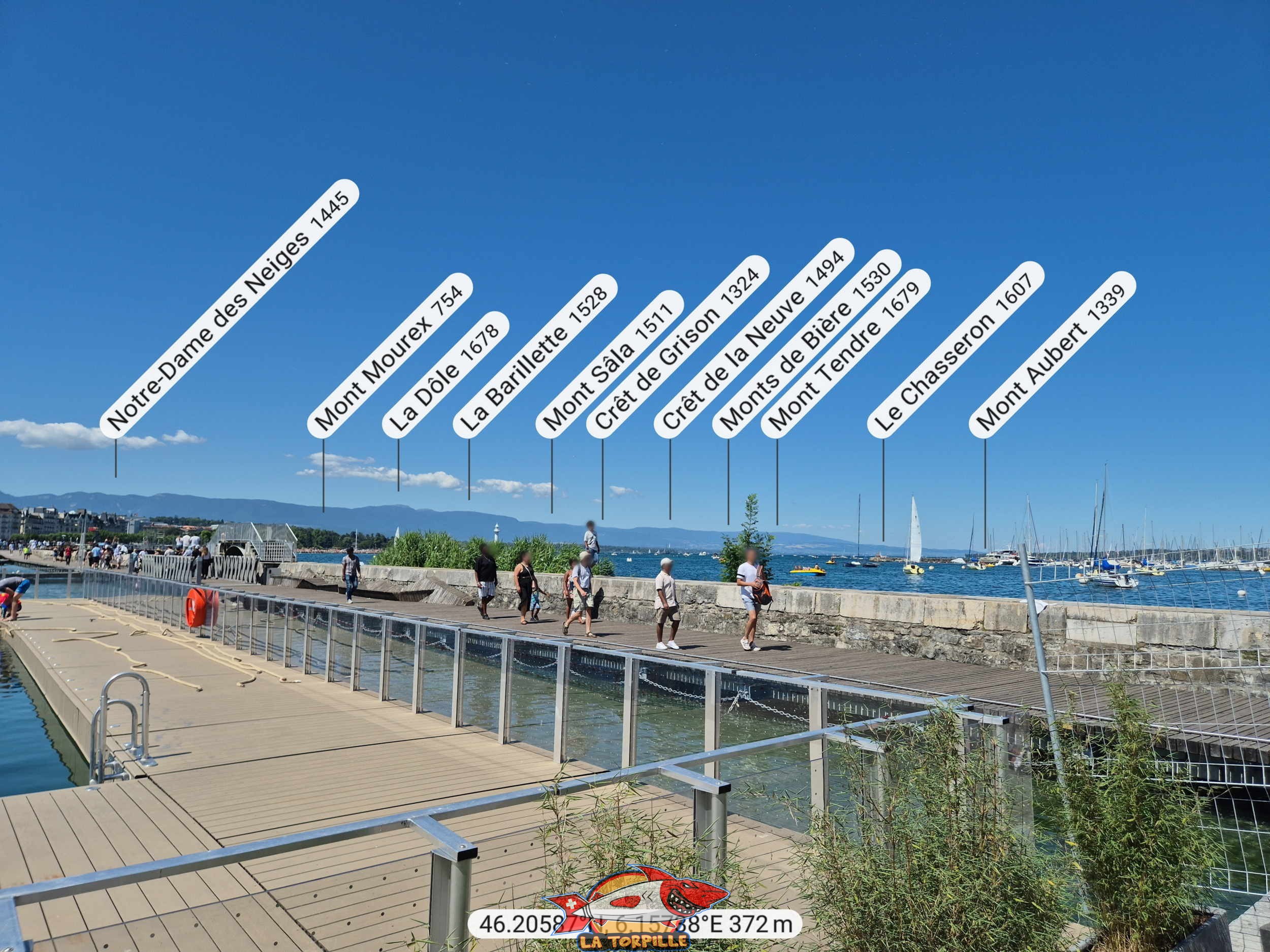 Le panorama, direction nord-ouest, depuis les Bains du Jet d’Eau, vers la chaine du Jura. Notre-Dame des Neiges, La Dôle, Grand Montrond.
