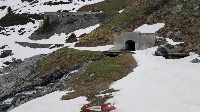 Sur le côté Ouest du lac de Cleuson, près du barrage, on peut observer un tunnel amenant de l’eau au lac. C’est la prise d’eau collectant les eaux de l’autre côté de la montagne à Tortin.