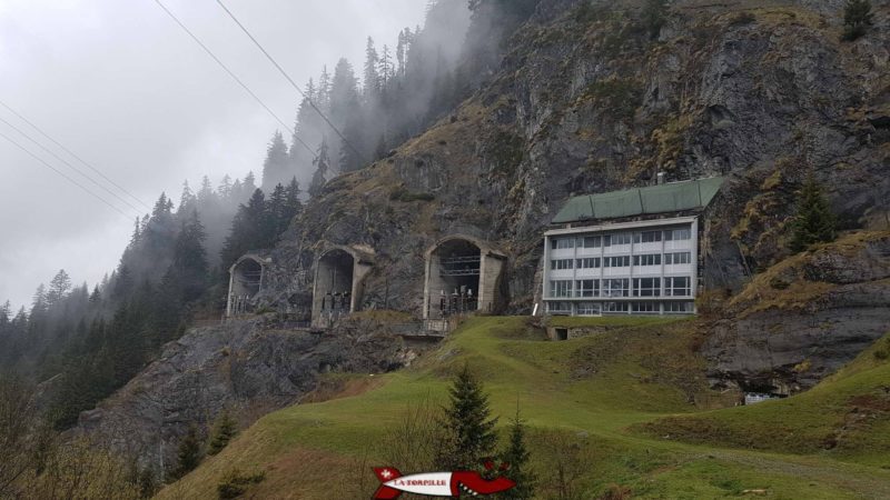 Les sorties électriques de la centrale de Fionnay – Gd-Dixence. Sur la droite, le bâtiment administratif.