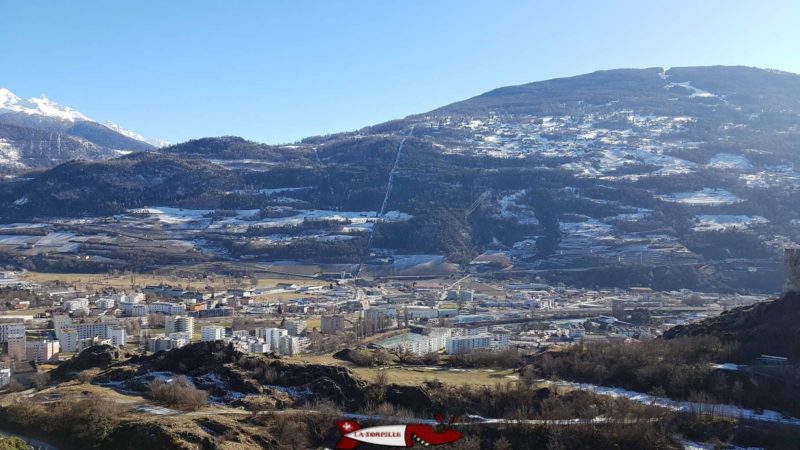 Une vue de la conduite forcée menant à l’usine de Chandoline depuis la colline du château de Tourbillon à Sion. En haut, à droite de l’image, le début de la piste de ski de l’Ours.