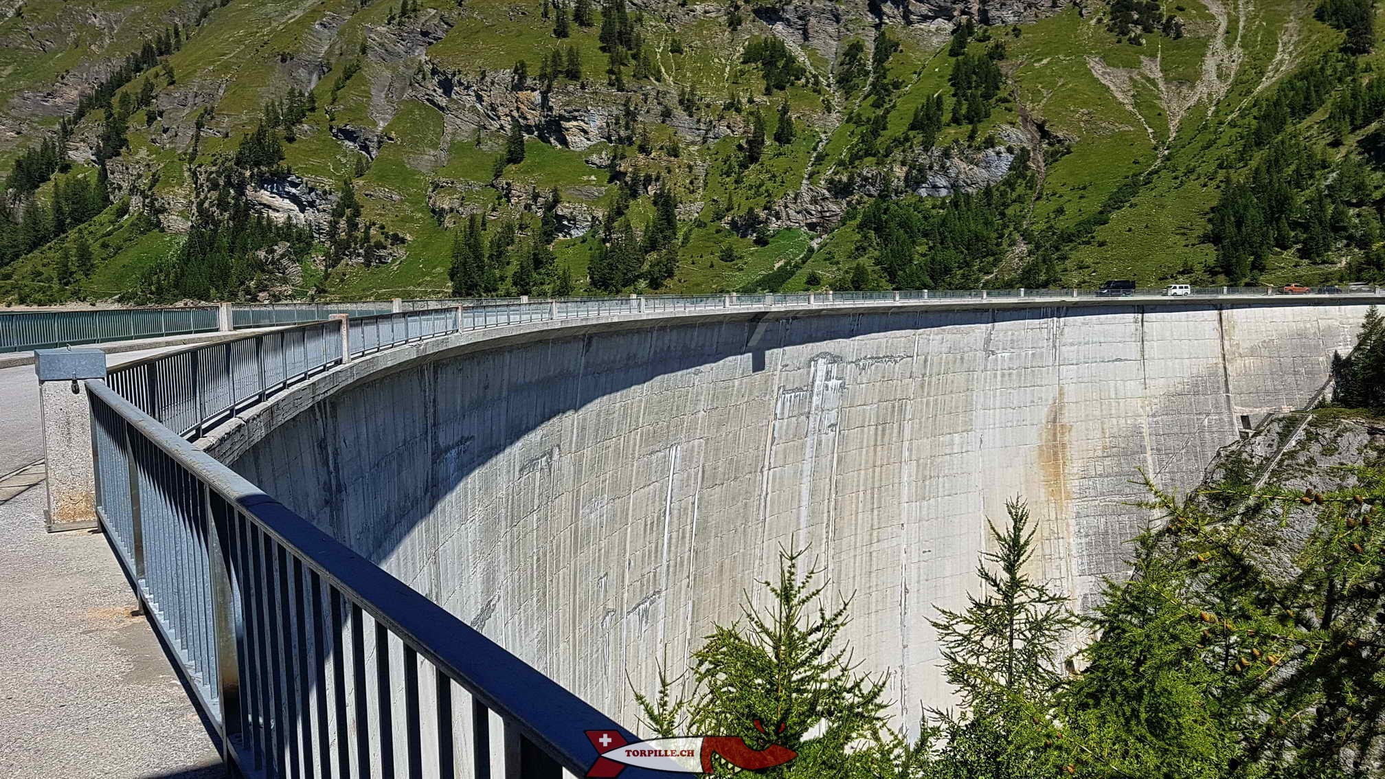 Le chemin passe sur le couronnement du barrage de Tseuzier pour rejoindre la rive gauche de la vallée de la Lienne.