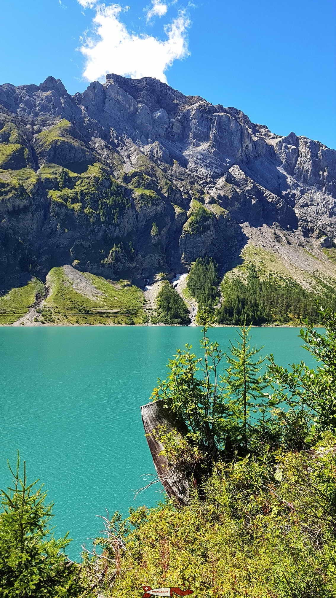 Lorsque que le chemin arrive au niveau de la source de Loquesse, il est possible de profiter d’une très belle vue d’ensemble sur le lac de Tseuzier.