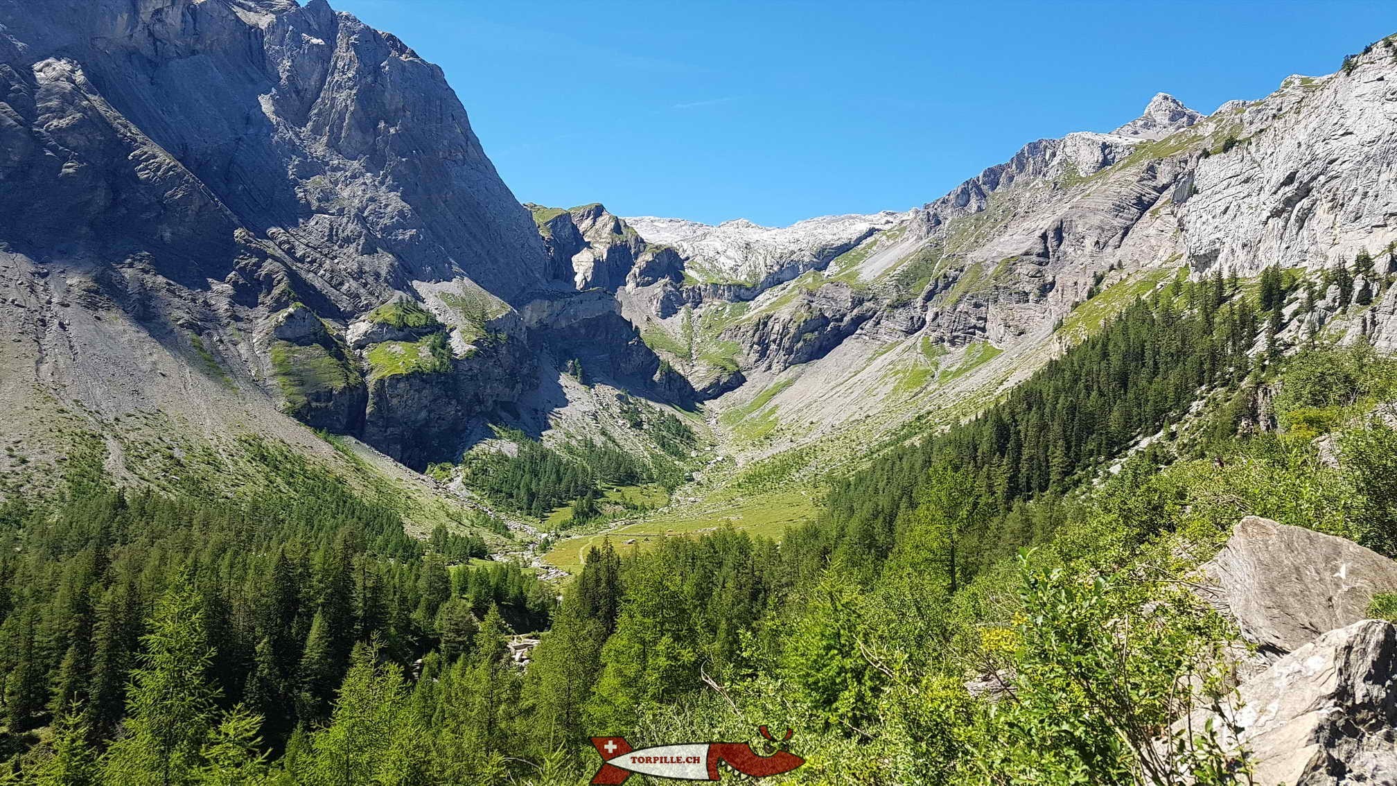 Le vallon des Eaux Froides sur la droite de l’image, sous le glacier de Téné ou glacier du Wildhorn.