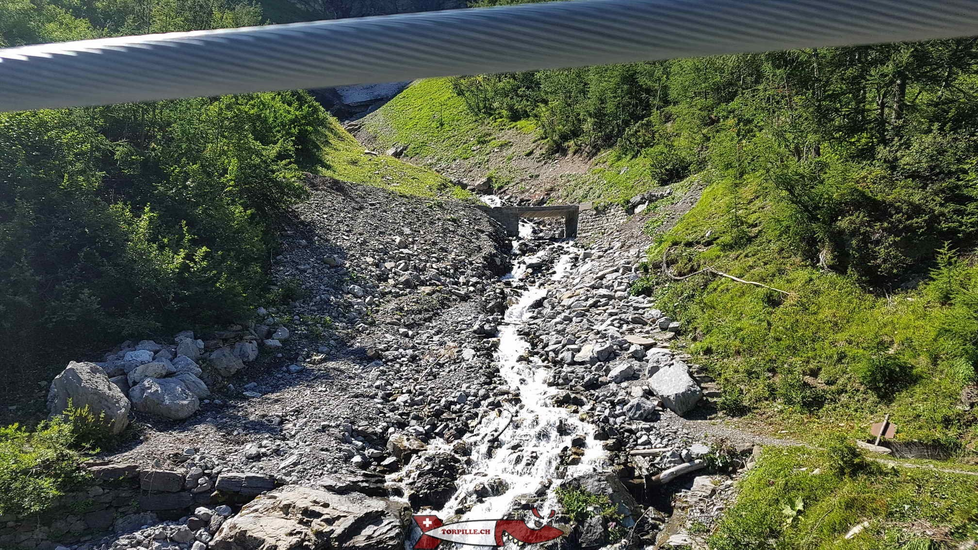 On traverse le pont en bois sur la Lienne qui permet de passer de la rive gauche (Icogne) à la rive droite (Ayent) de la rivière.