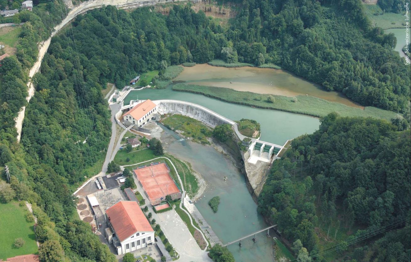 Une vue d’ensemble de la centrale sous la porte de Bourguillon. La centrale rejette les eaux turbinées dans un méandre de la Sarine.