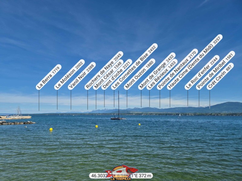 La vue direction Est depuis la plage de Mies. Le Moléson, Les Rochers de Naye.