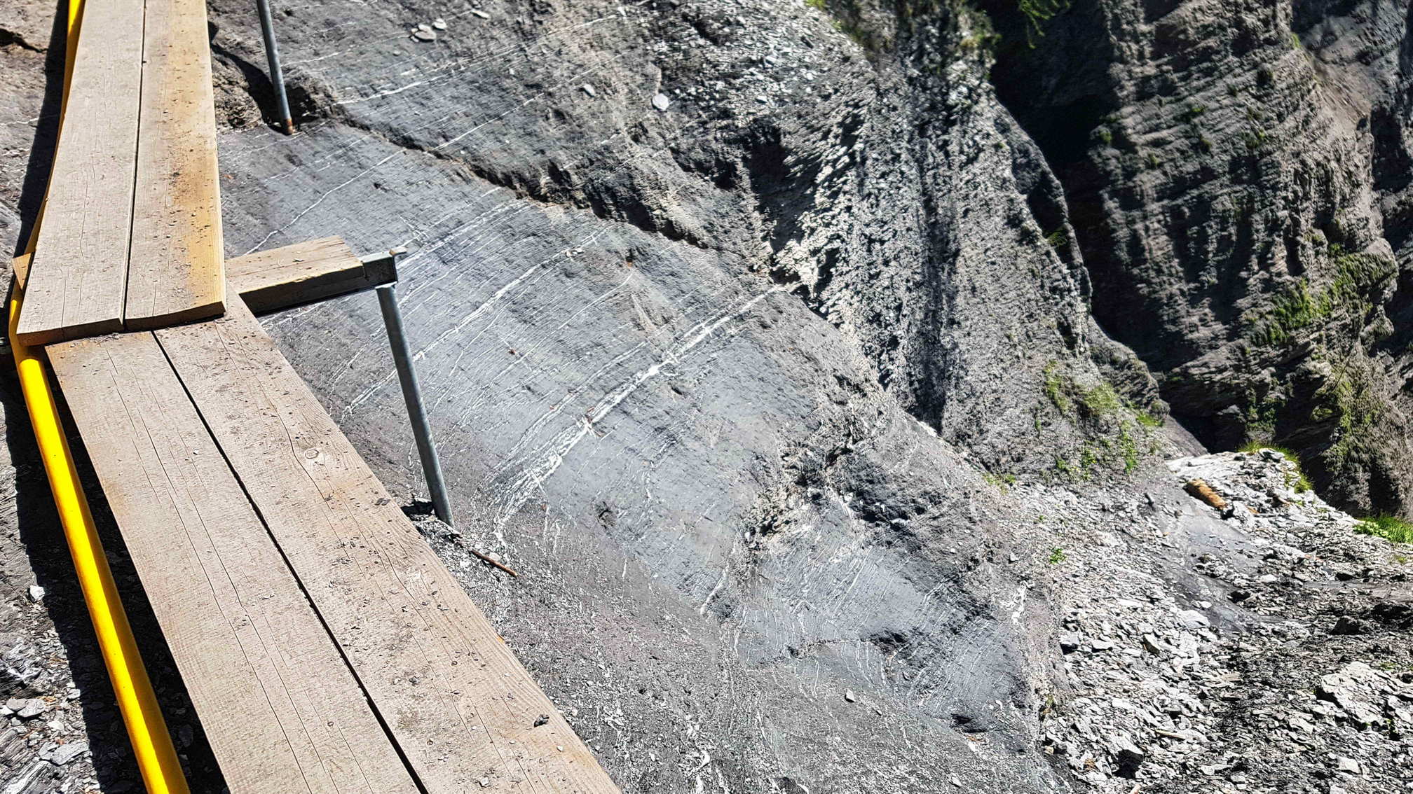 La même photo du bisse aujourd’hui. Le chemin passe à l’intérieur de l’ancien bisse et des barrières viennent sécuriser le randonneur.