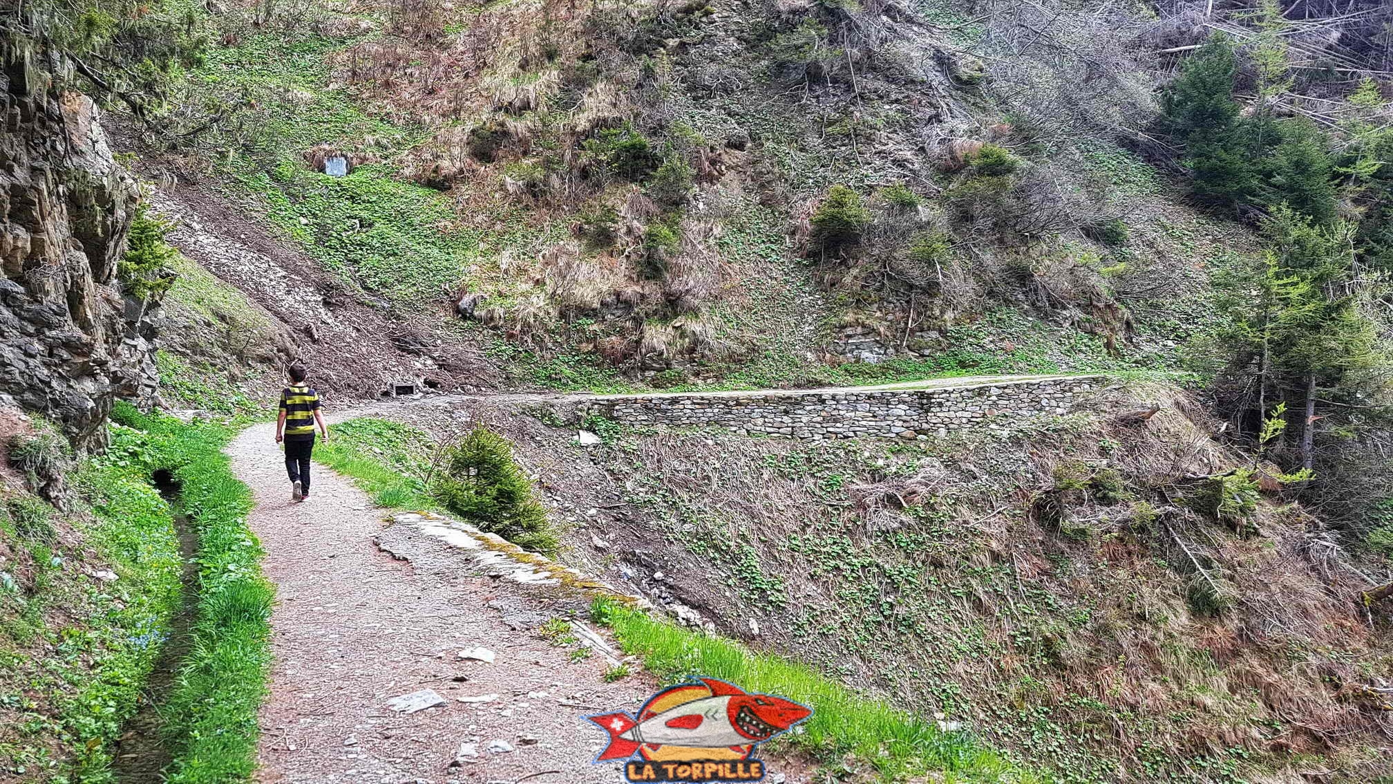 Une passerelle métallique permet de longer une paroi rocheuse. Un chemin au-dessus permet de l’éviter.