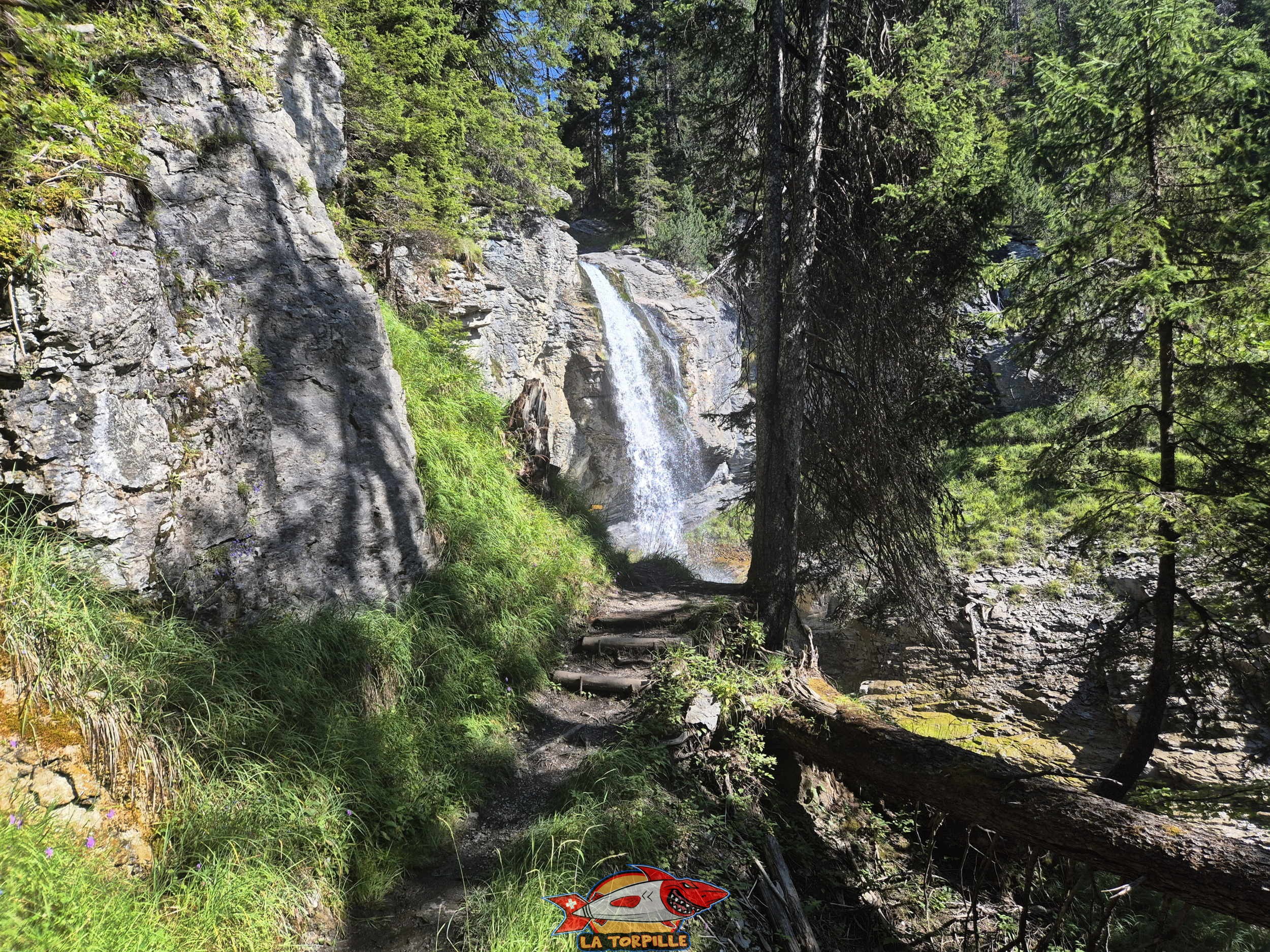 En allant à la cascade depuis Crêta d’Asse, le début du parcours est relativement plat avant de descendre en très forte pente.