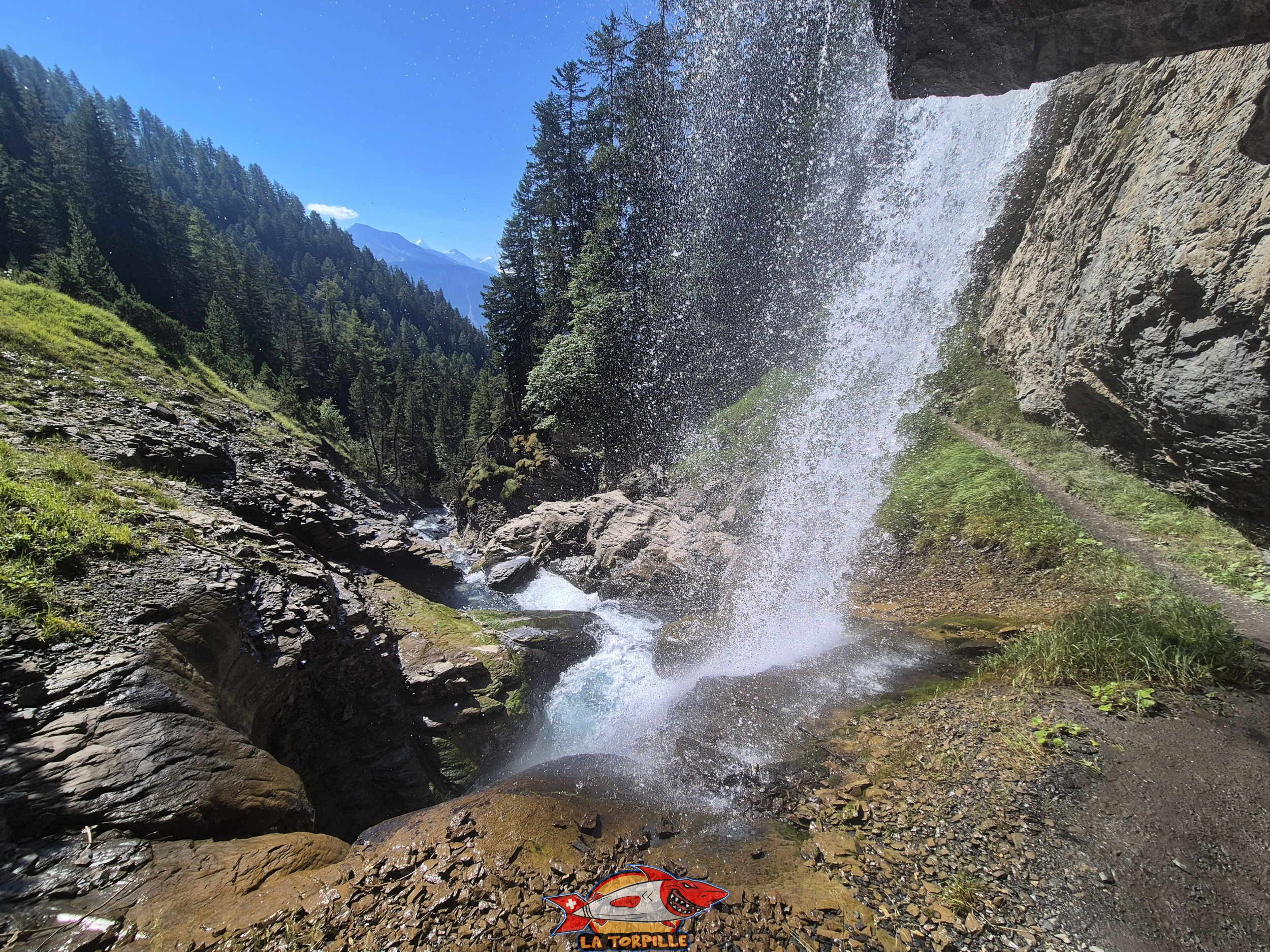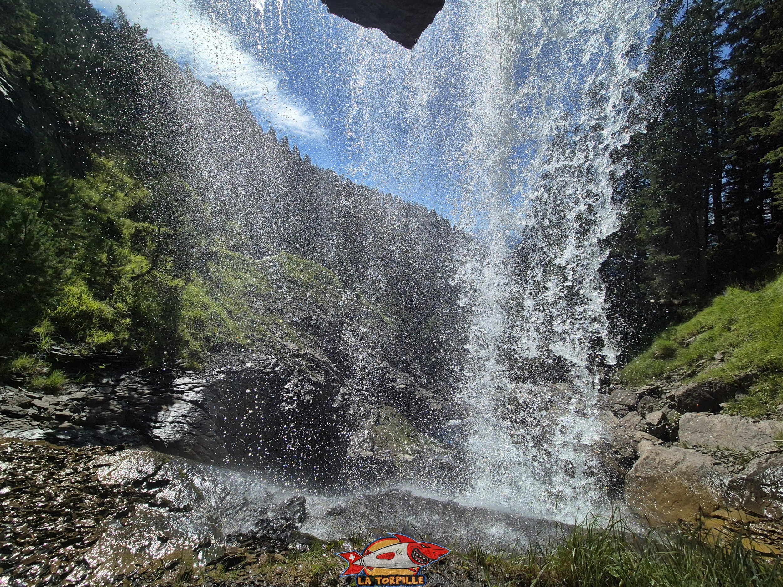 La cascade du Pichiour ou chute de la Raspille. Un chemin permet de passer sous la chute d’eau.