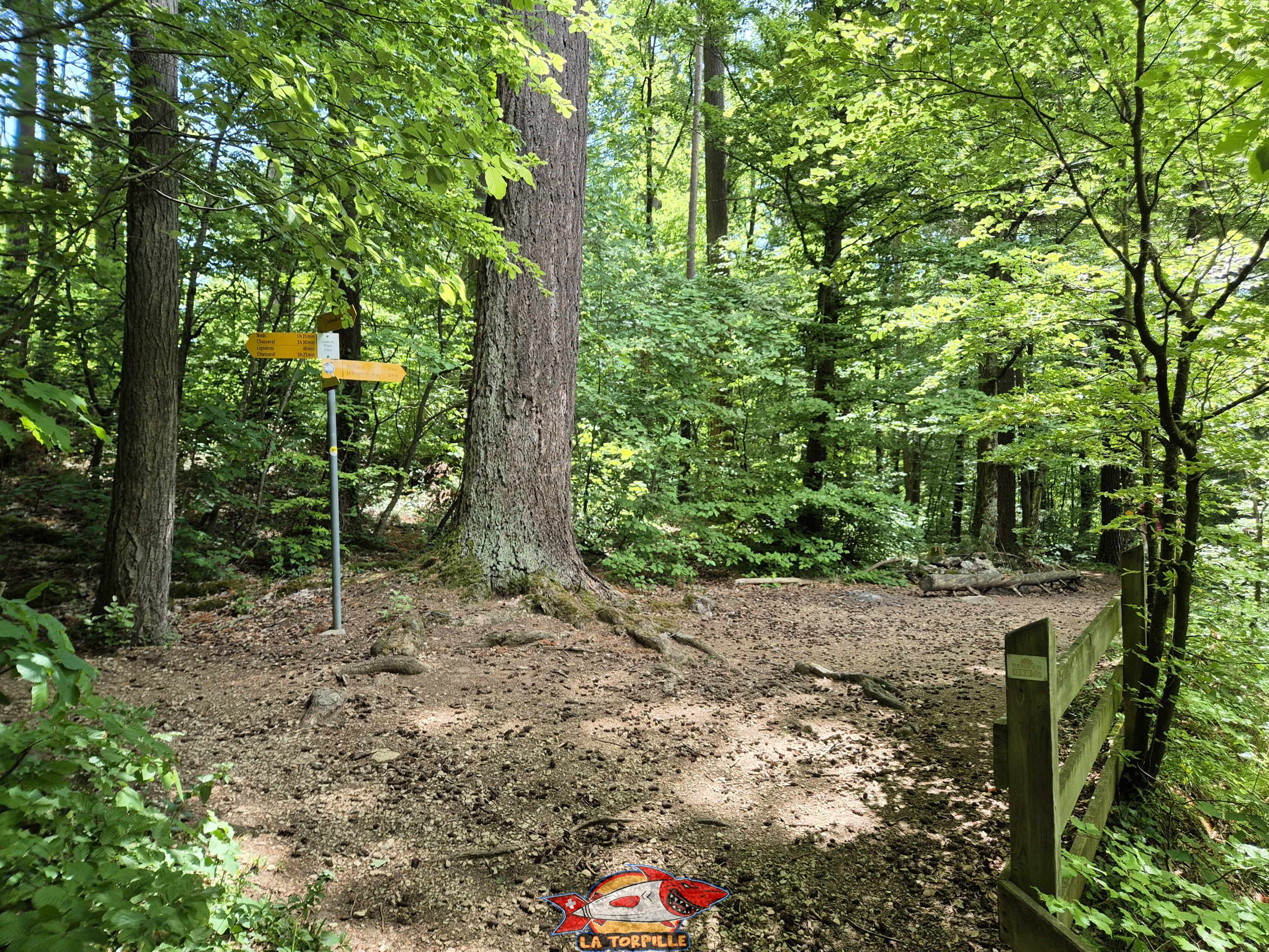 Le sommet de la Combe du Pilouvi à 710 mètres d’altitude. Un panneau indique qu’il faut 45 minutes pour rejoindre La Neuveville, 40 min pour Lignières, 1 h 35 min pour Nods et 3 h 30 min pour le Chasseral.