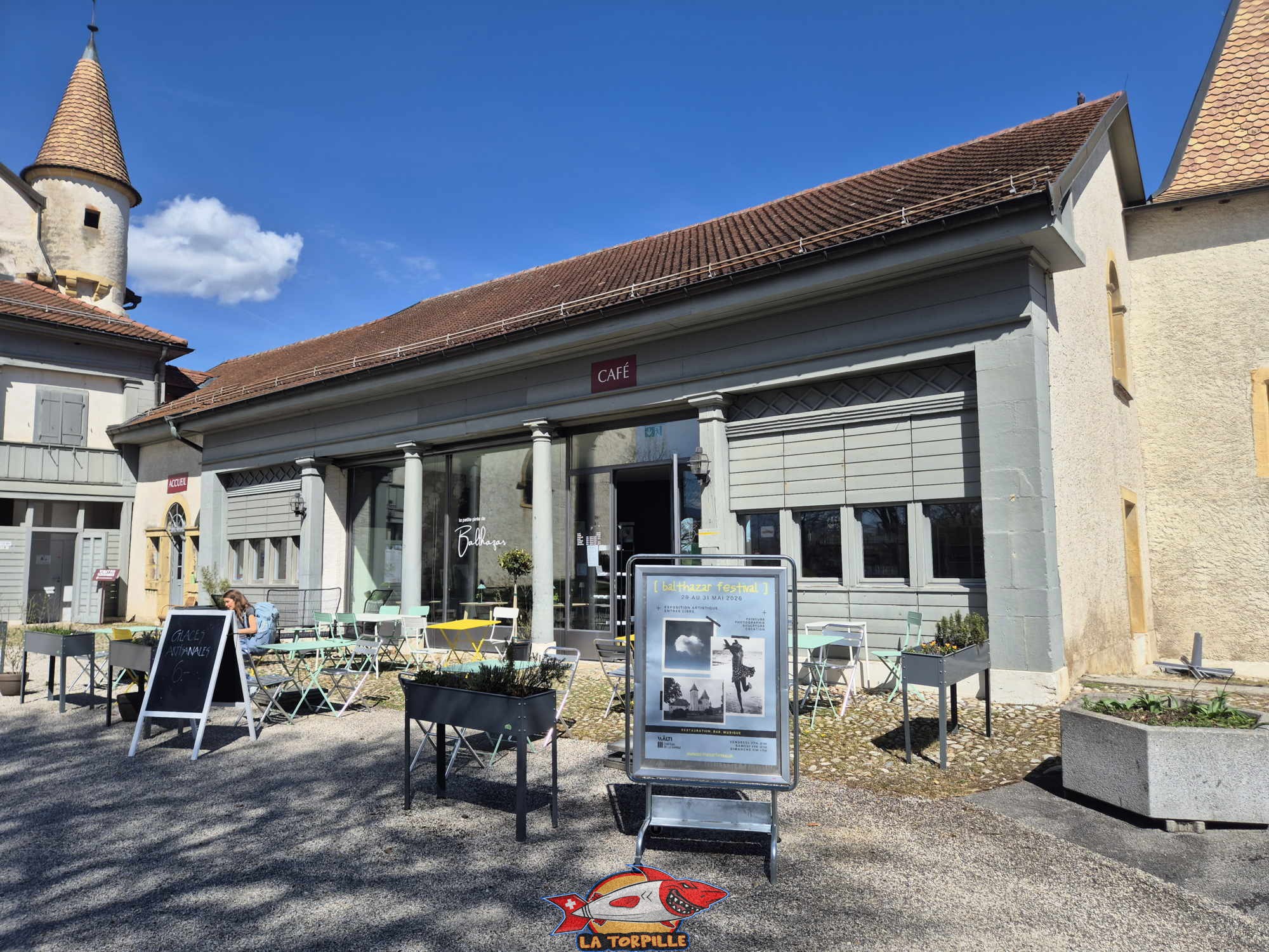 La buvette du château de La Sarraz, appelée La Petite Pinte de Balthazar, est un petit café-bar convivial avec une jolie terrasse. Elle se trouve dans un bâtiment comprenant aussi l’accueil et adossé au château.