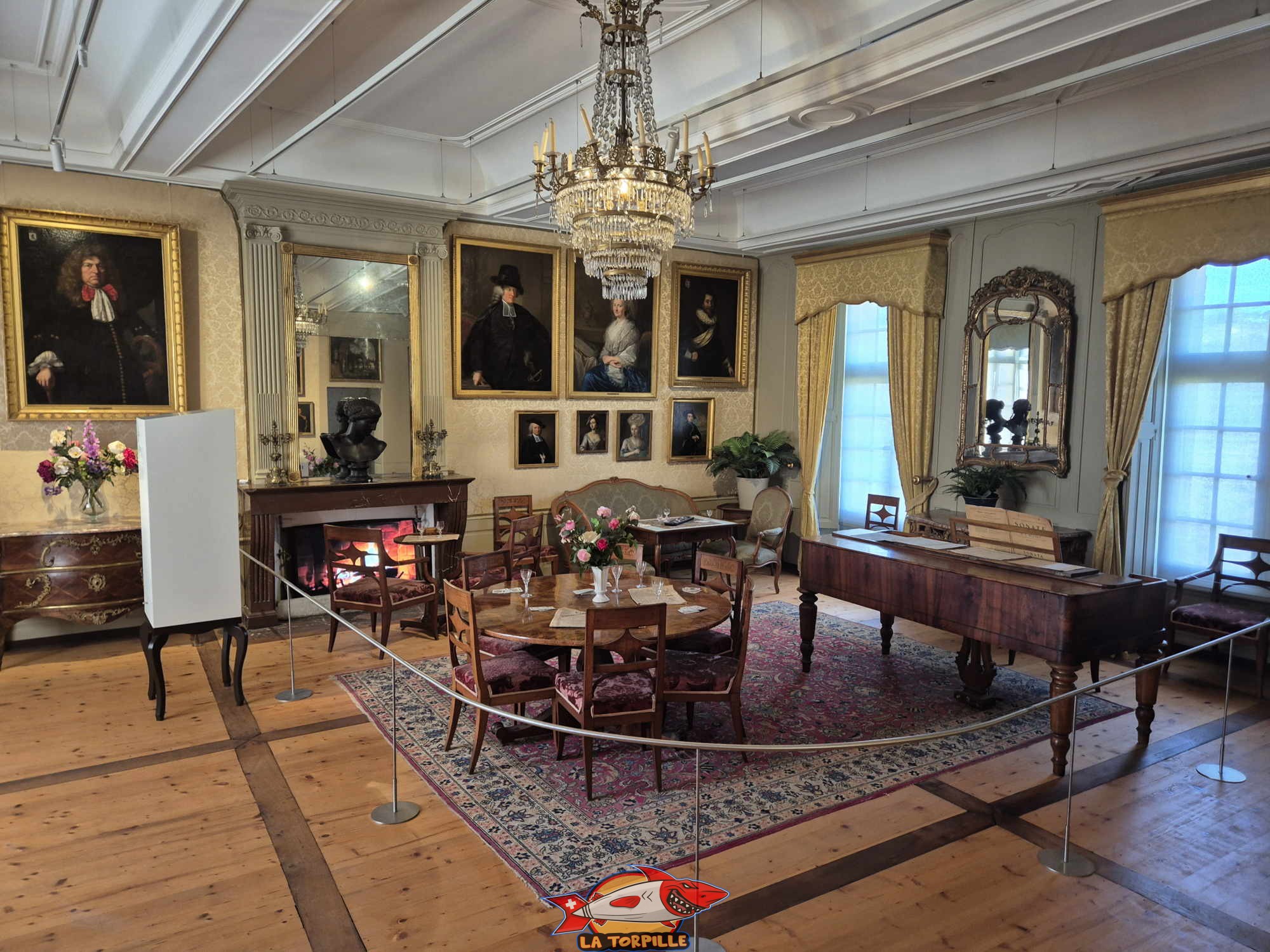 Le Grand Salon est la plus belle pièce du château. C’est à cet endroit que la dernière châtelaine, Hélène de Mandrot (1867-1948), recevait ses invités.