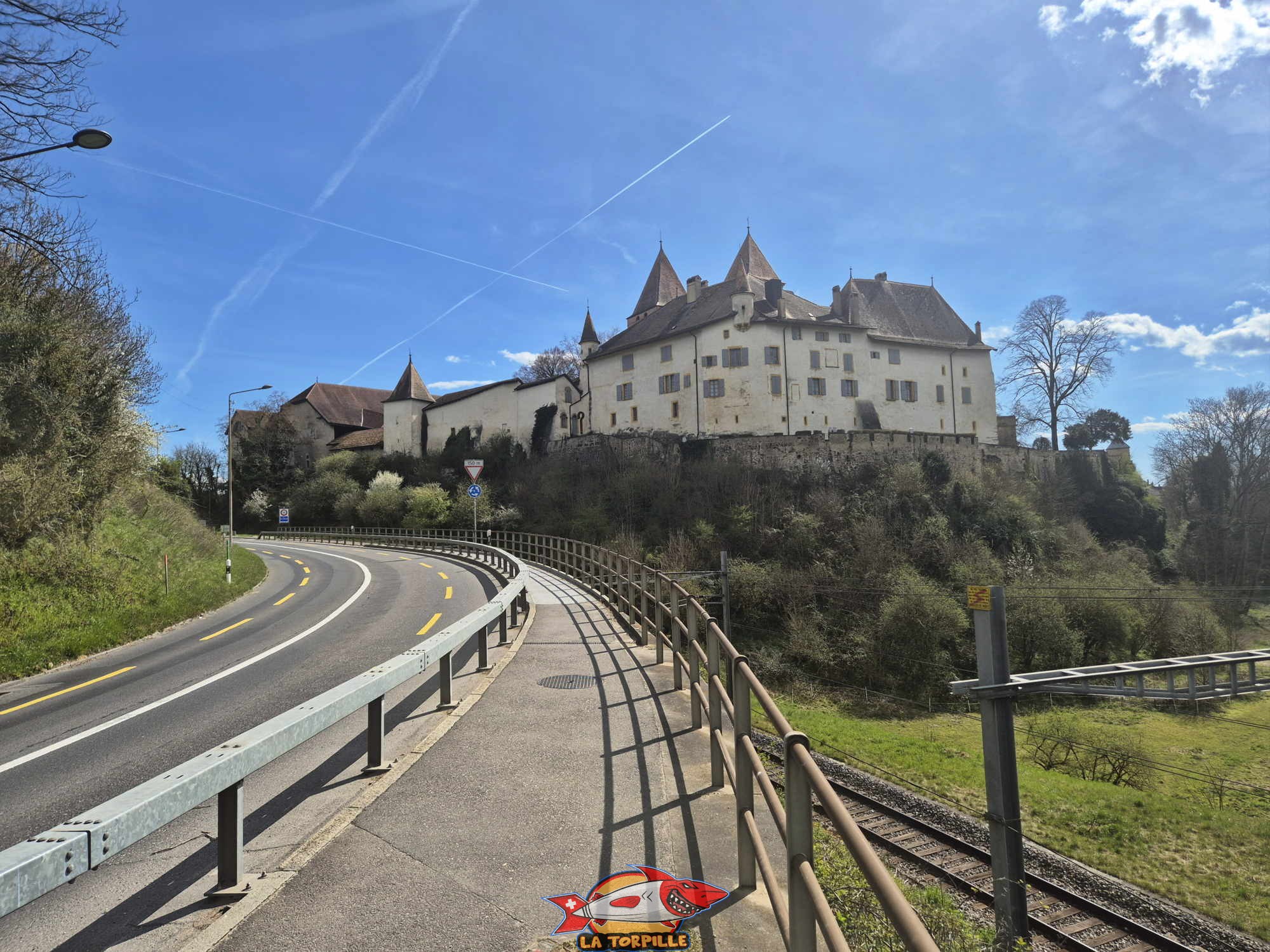 La voie éloignée sur le château de La Sarraz, depuis la route de Cossonay, au sud.