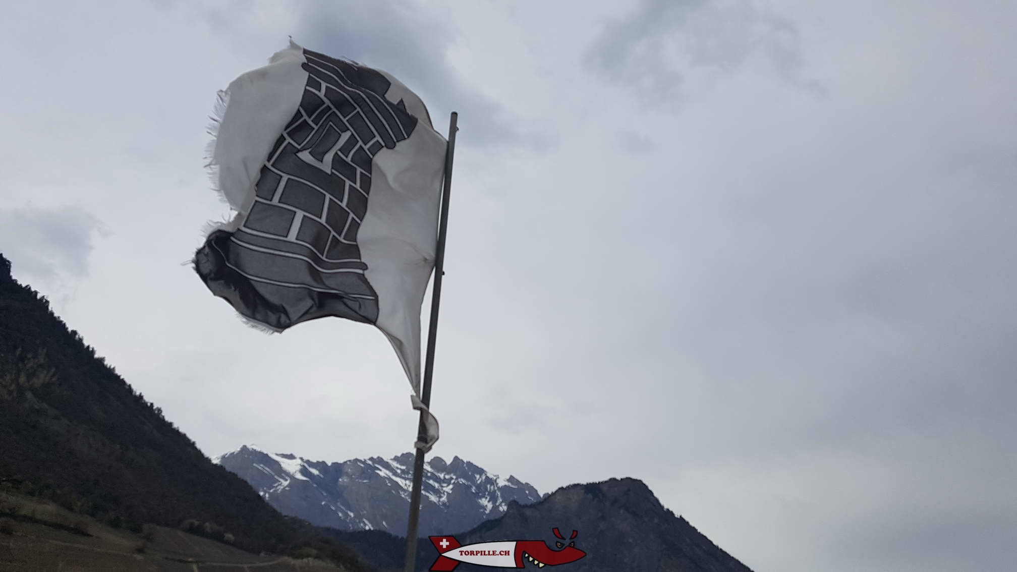 Le drapeau de Saillon, symbolisé par une tour, flotte au vent de la vallée du Rhône.