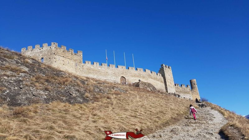 Le début de la montée depuis la place Maurice-Zermatten. Un panneau indique les horaires d’ouverture du château et des visites guidées. En hiver, l’intérieur du château est fermé.