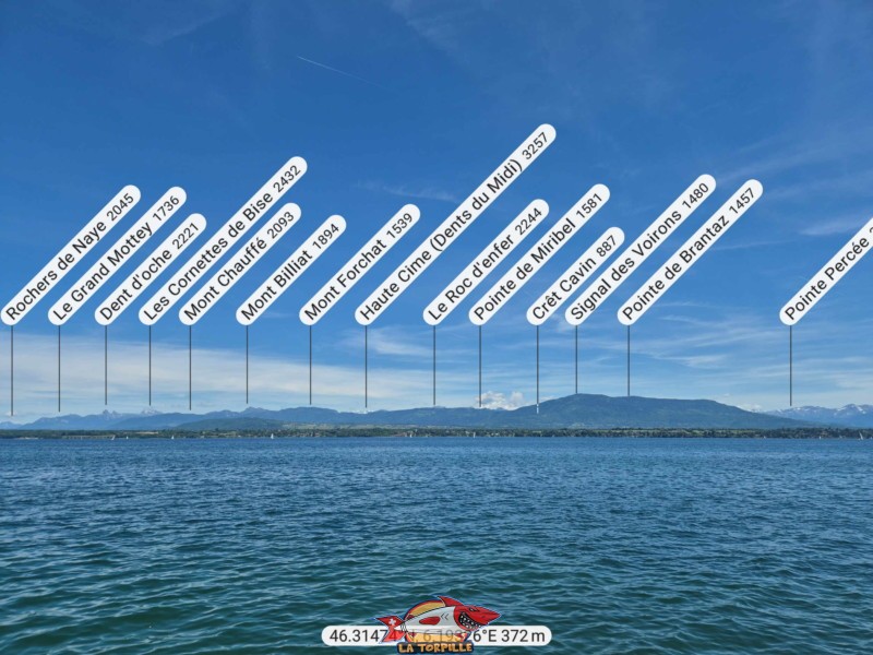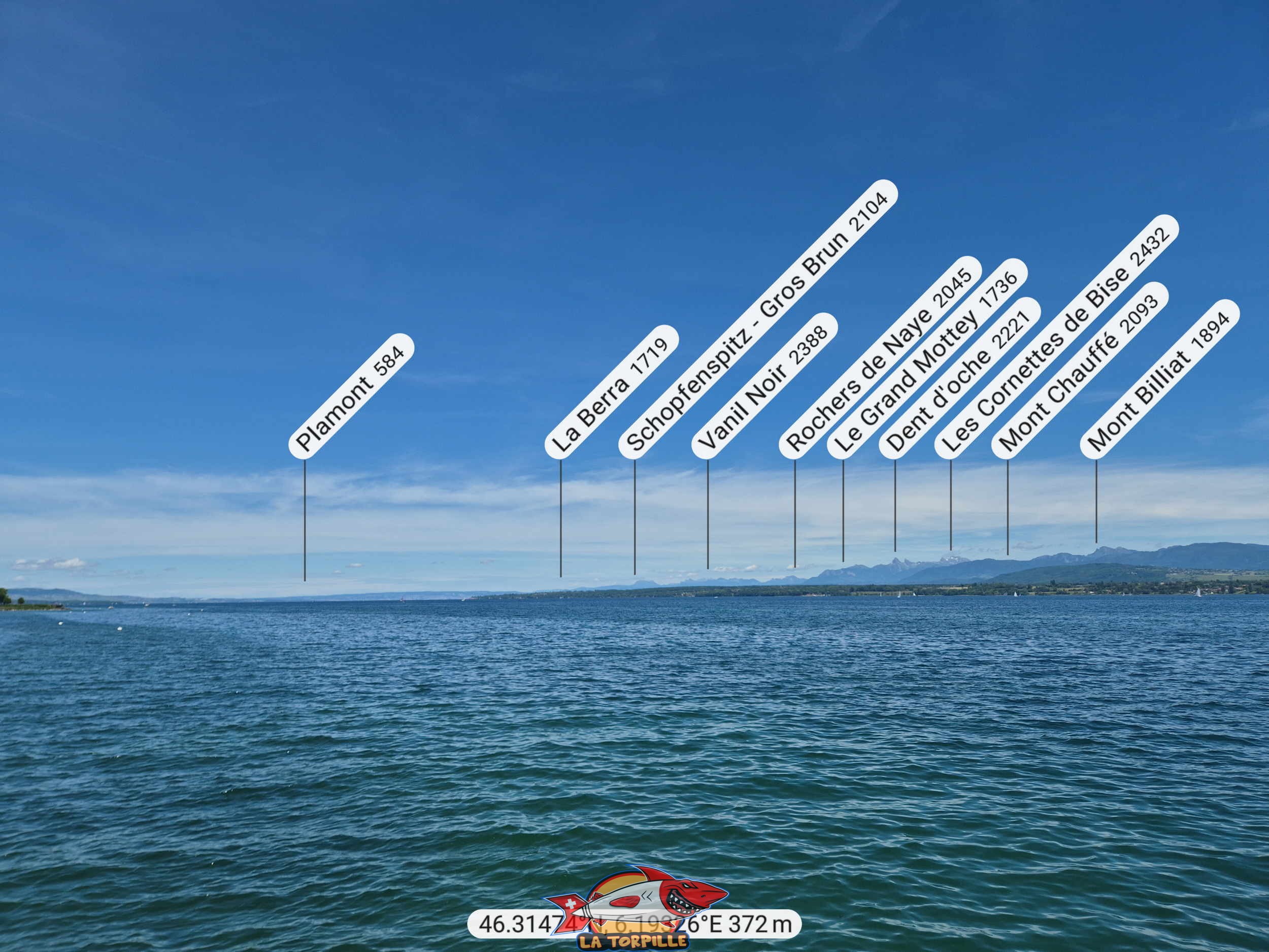 La vue direction Nord-Est-Est depuis le débarcadère de Coppet. Le Vanil Noir, Les Rochers de Naye.