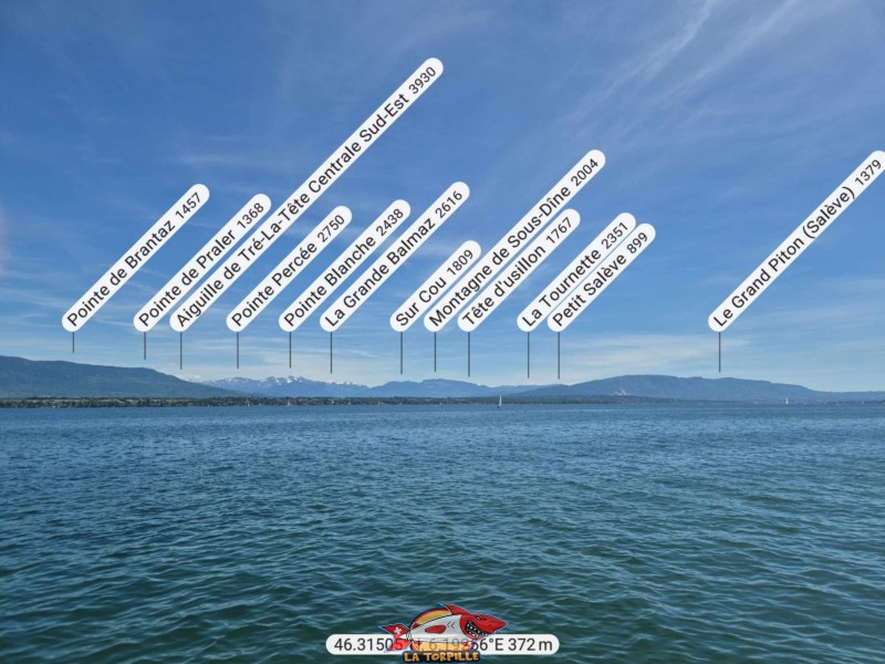 La vue direction Sud-Est-Est depuis le débarcadère de Coppet. Les Dents du Midi.