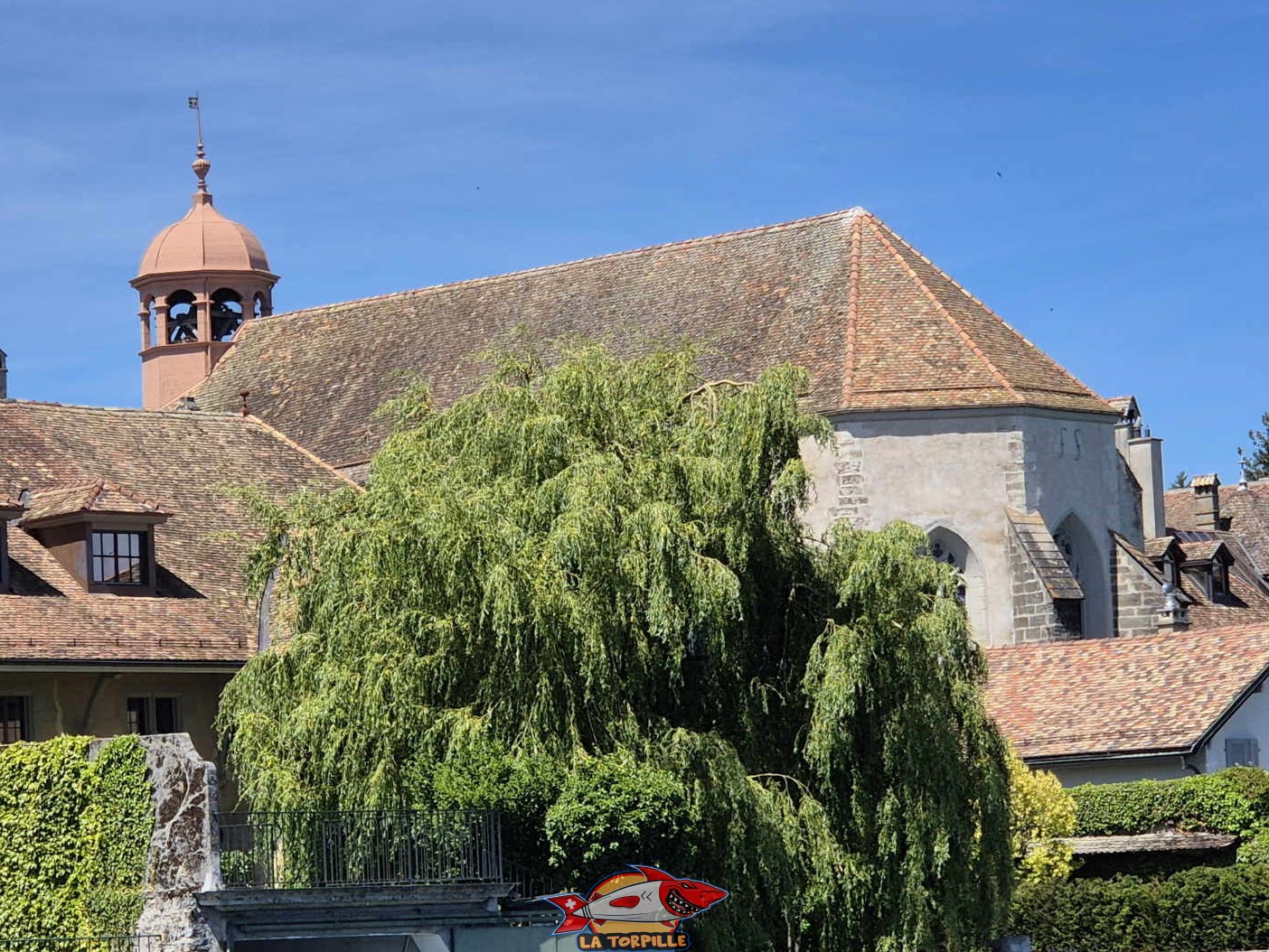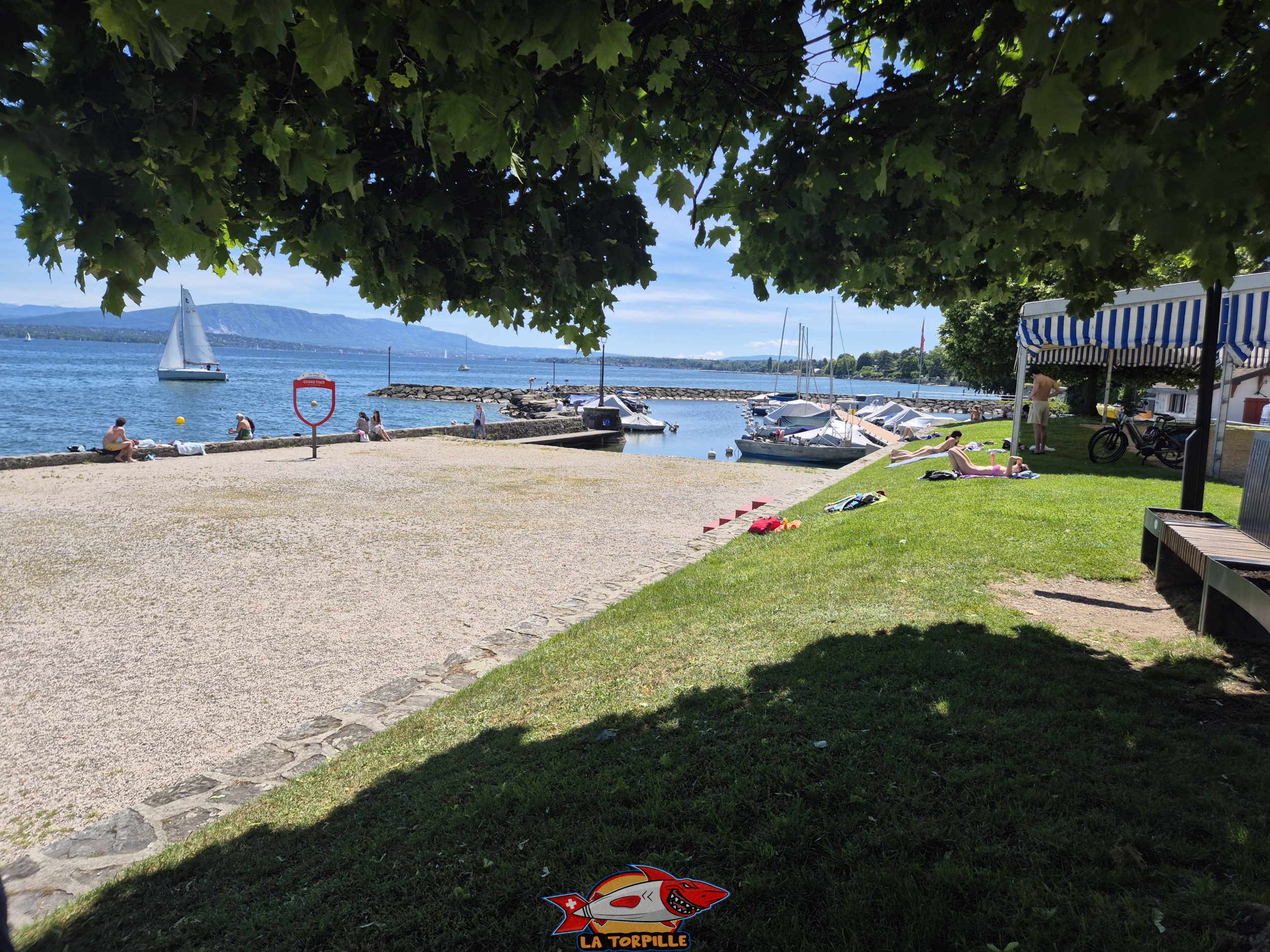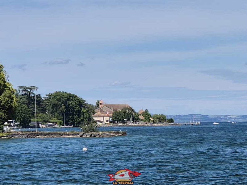 Le temple (droite) et le débarcadère (gauche) de Coppet depuis la plage des Rocailles.
