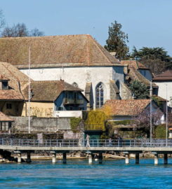 Le débarcadère CGN avec le temple de Coppet. Photo : Wikipédia