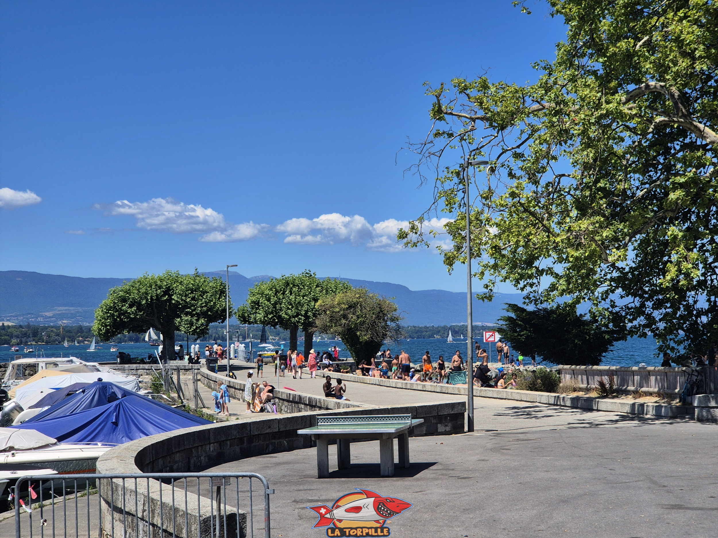 Toute la longueur de la jetée qui mène au débarcadère des Eaux-Vives sur la droite.