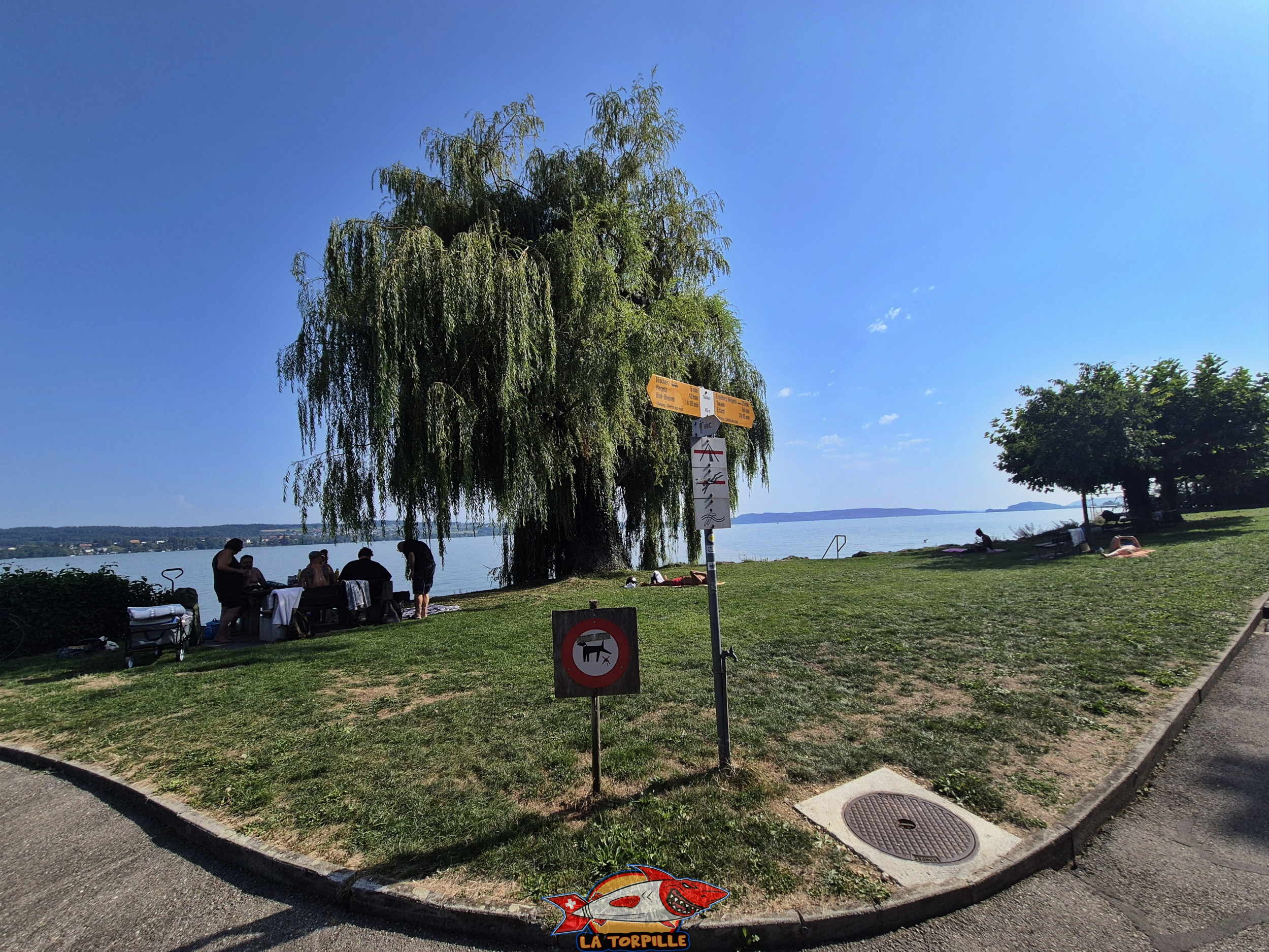 Un panneau qui indique que, par le chemin des rives, Bienne est à 1 heure 10 minutes de marche et Douanne à 50 minutes.