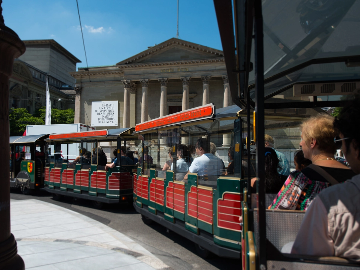 Geneva Sightseeing Tour propose un petit train touristique qui parcourt, avec deux parcours, la vieille ville de Genève ou la rive droite de la rade.