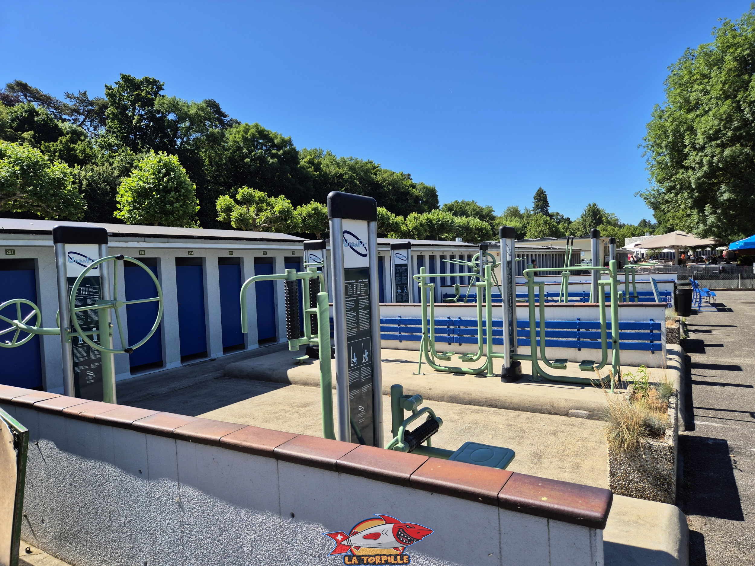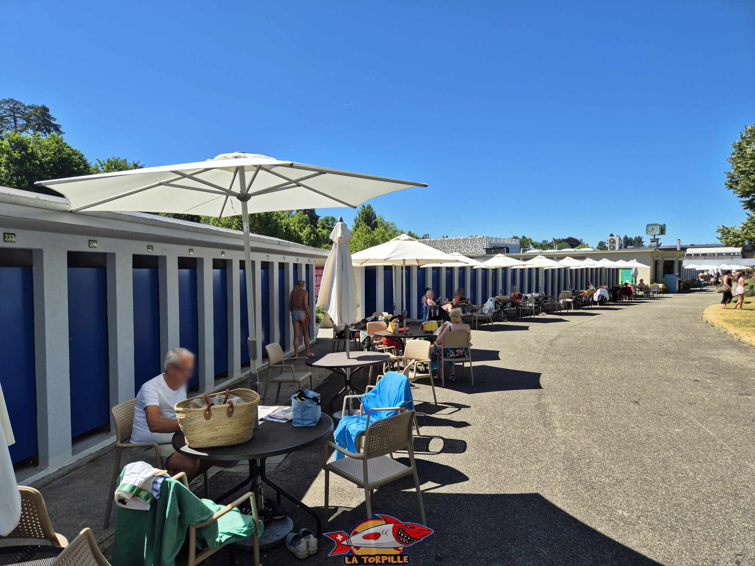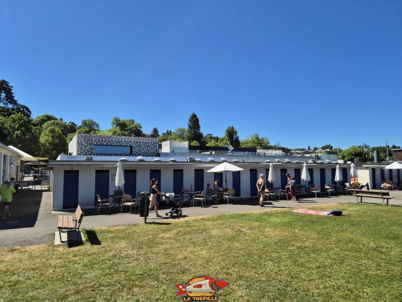 Les vestiaires, avec, en arrière-plan, le bain-bleu.. Genève-Plage, Cologny. Lac Léman.