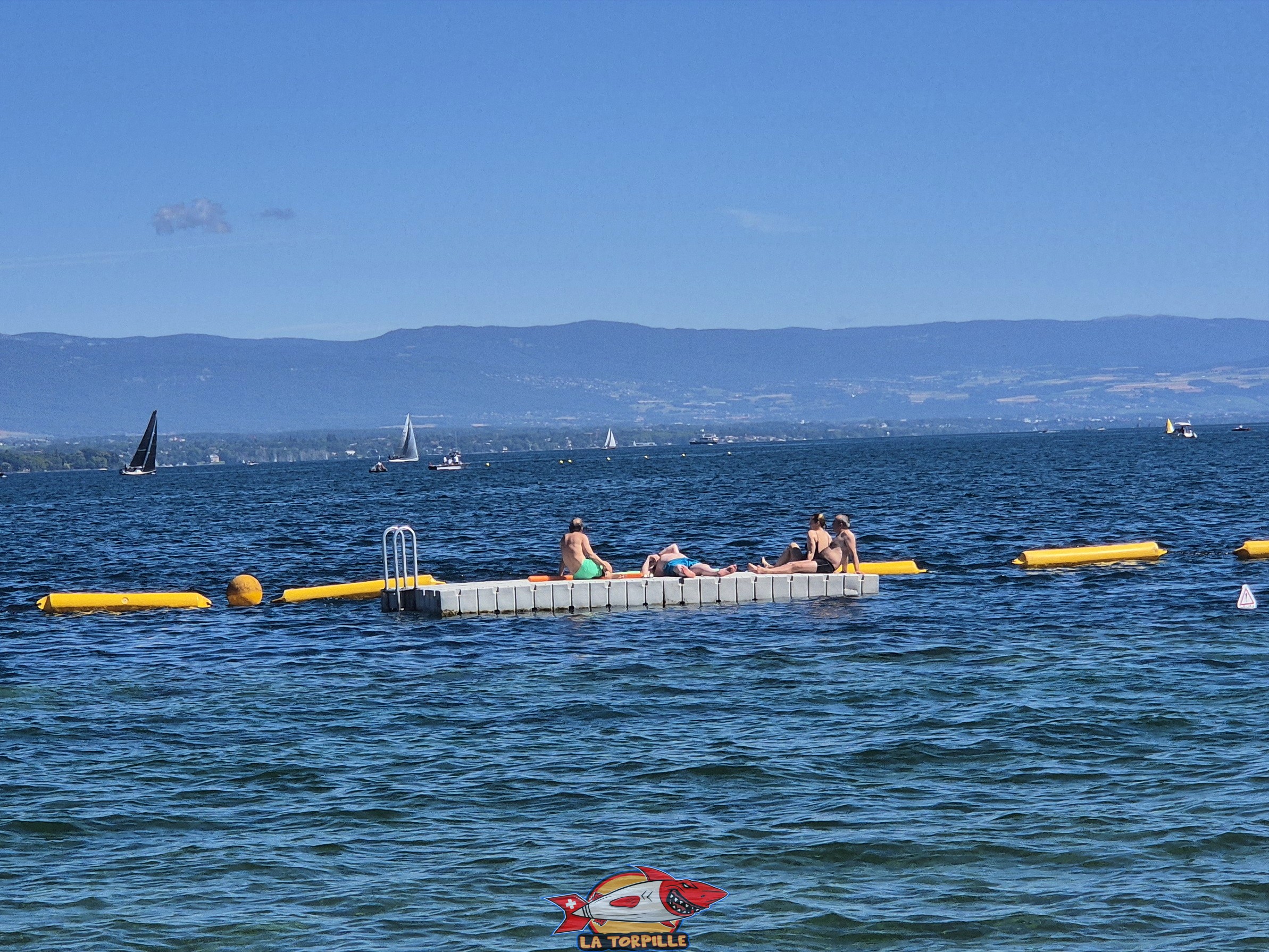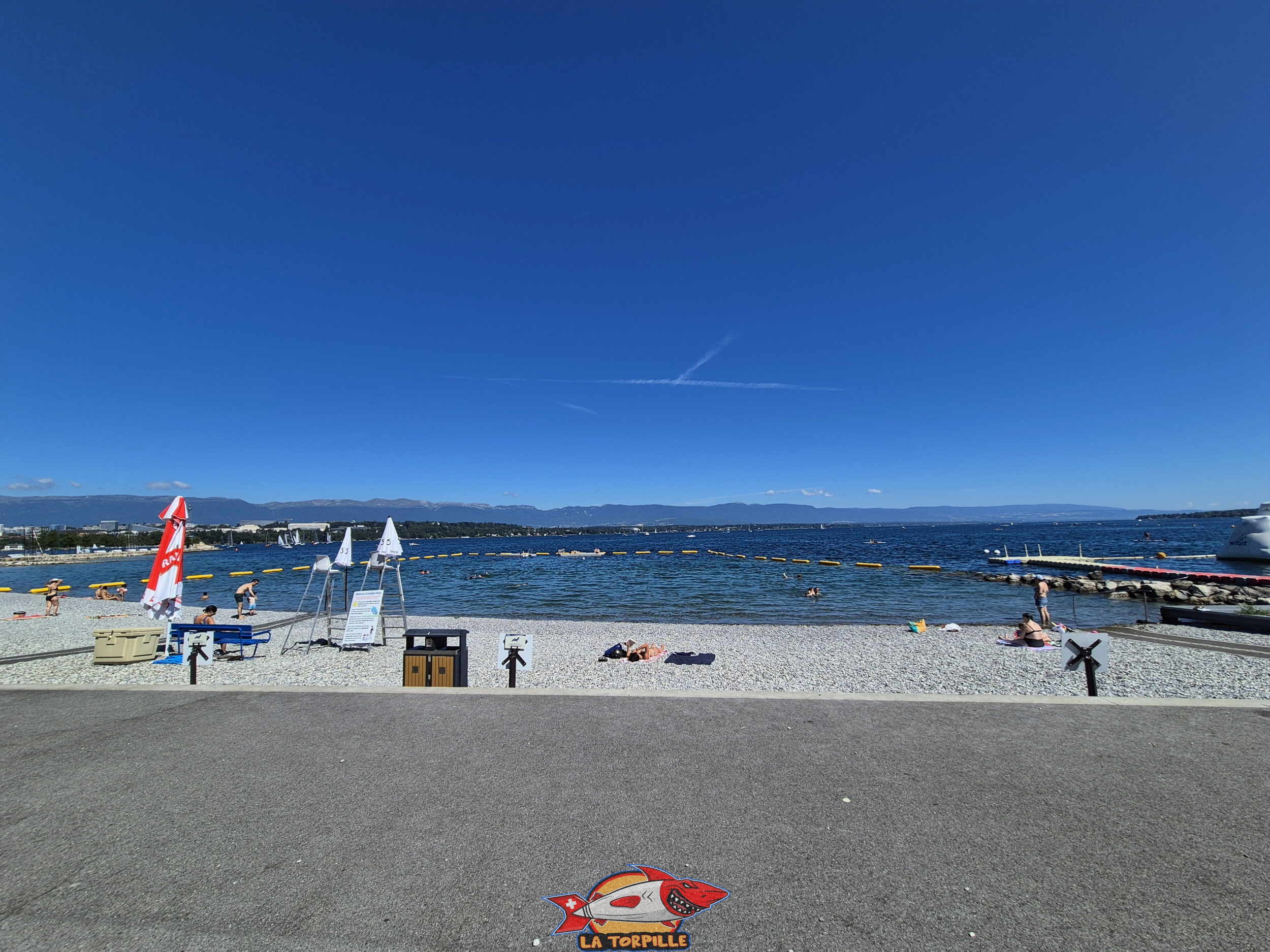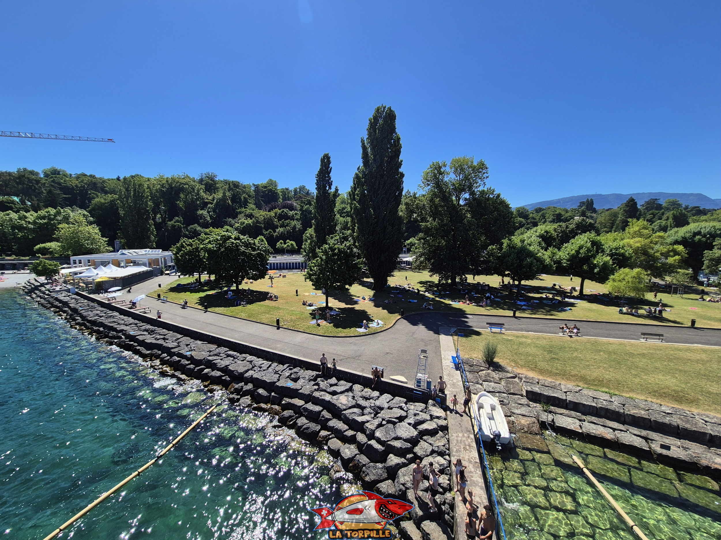 La vue direction nord-est. Au milieu, l'espace de baignade du quai de Cologny, et, à droite, Tropical Corner. Sommet du plongeoir. Genève-Plage, Cologny. Lac Léman.