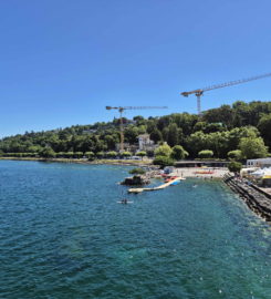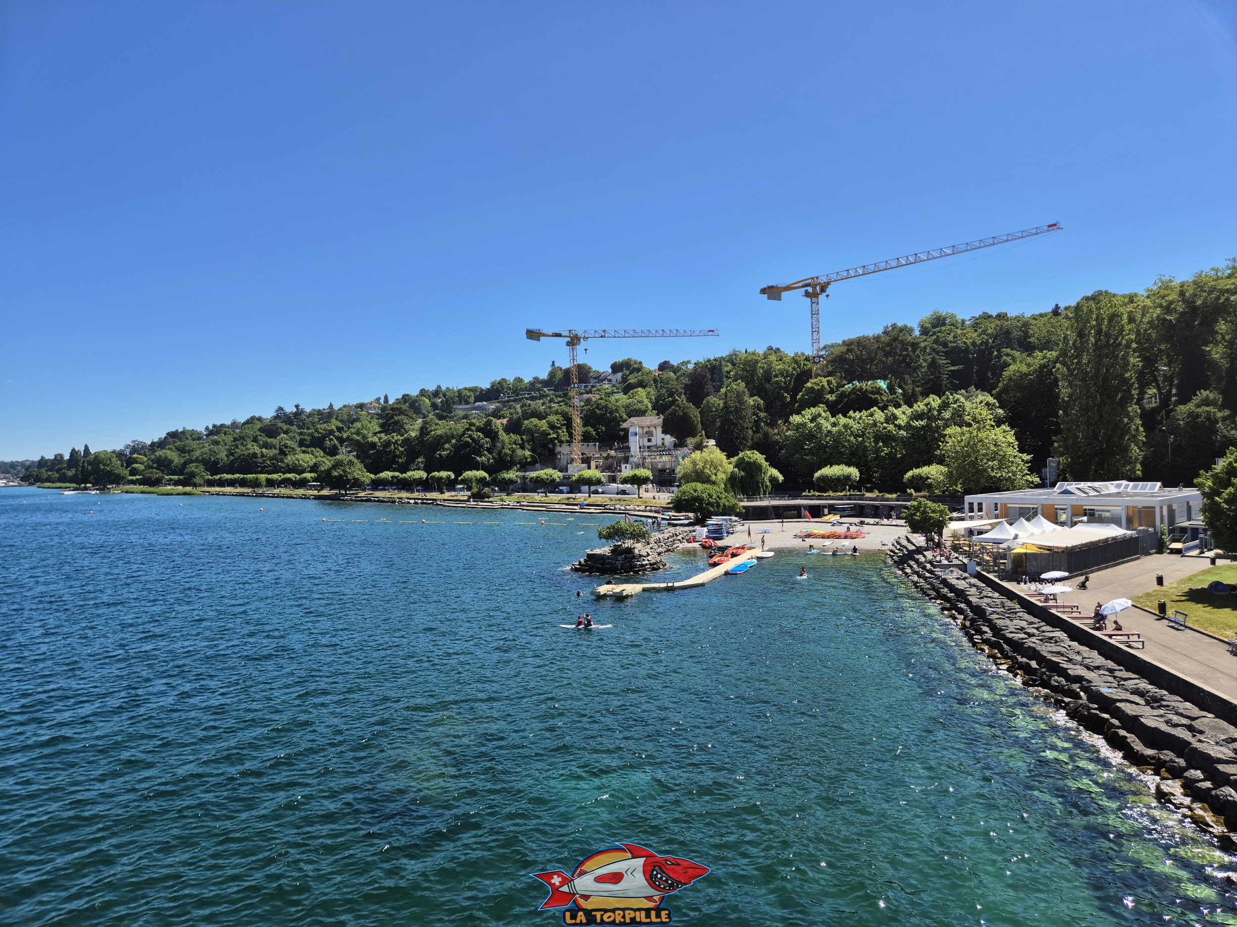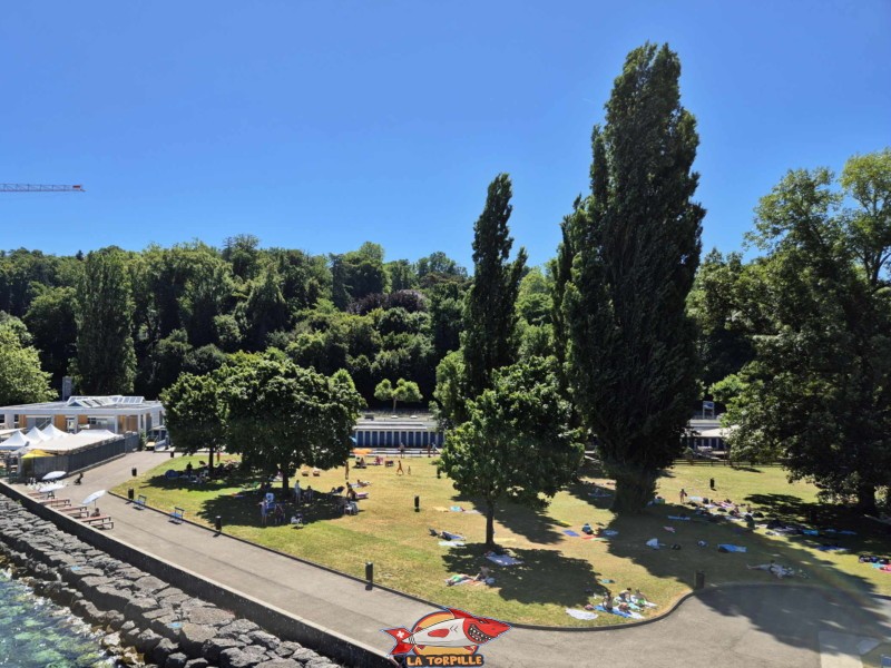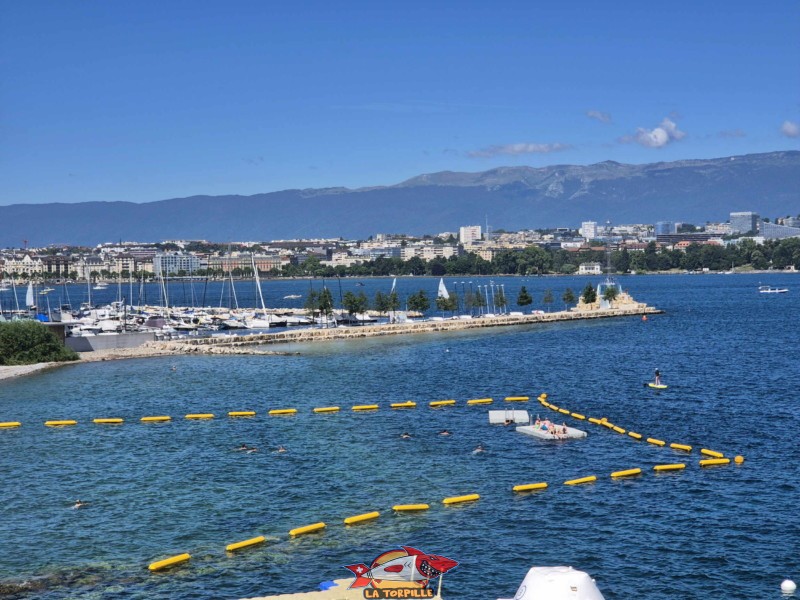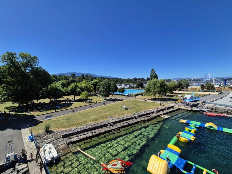La vue direction nord-est. Au milieu, l’espace de baignade du quai de Cologny, et, à droite, Tropical Corner.