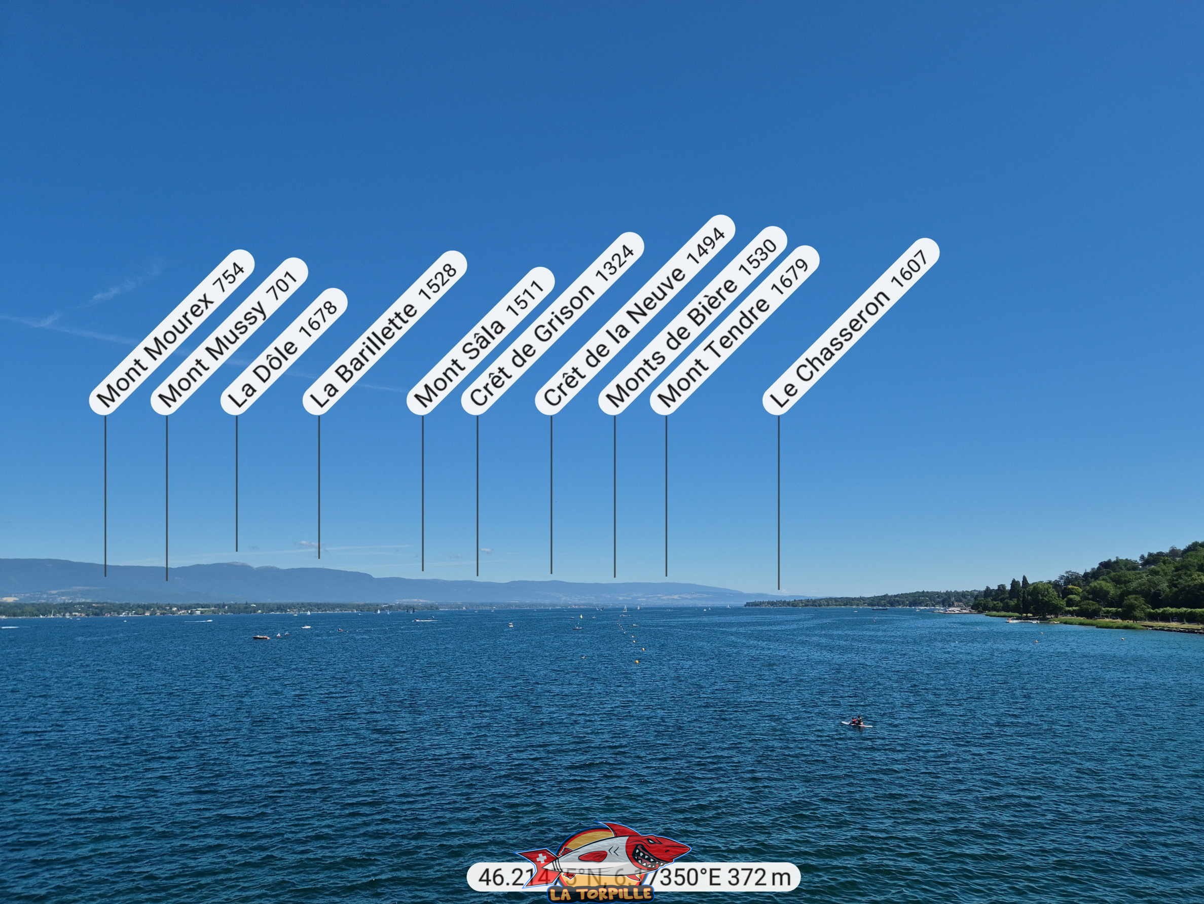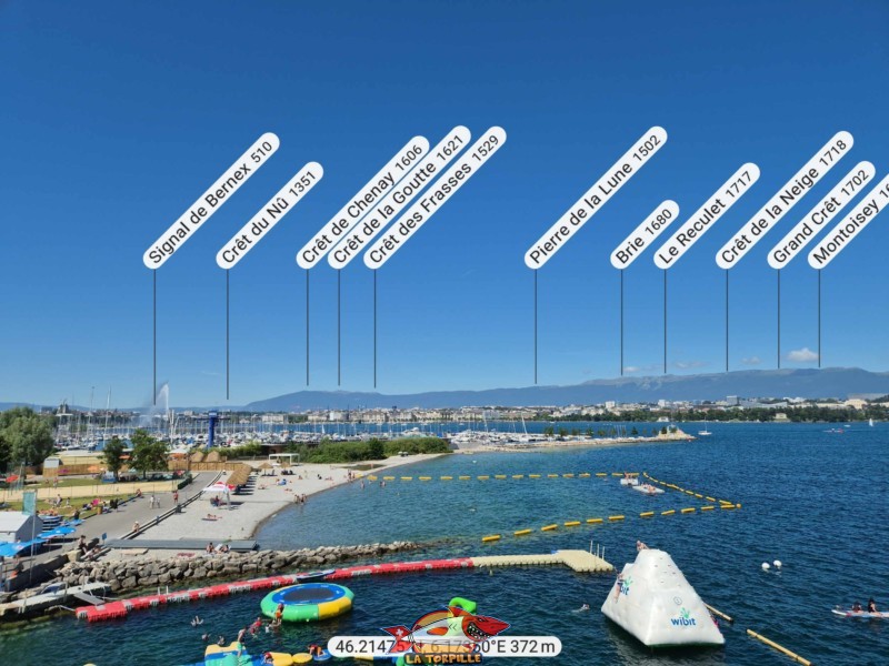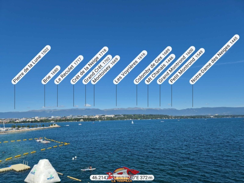 Le panorama, direction nord, vers la chaîne du Jura. La Dôle, le Mont Tendre et le Le Chasseron. Genève-Plage.