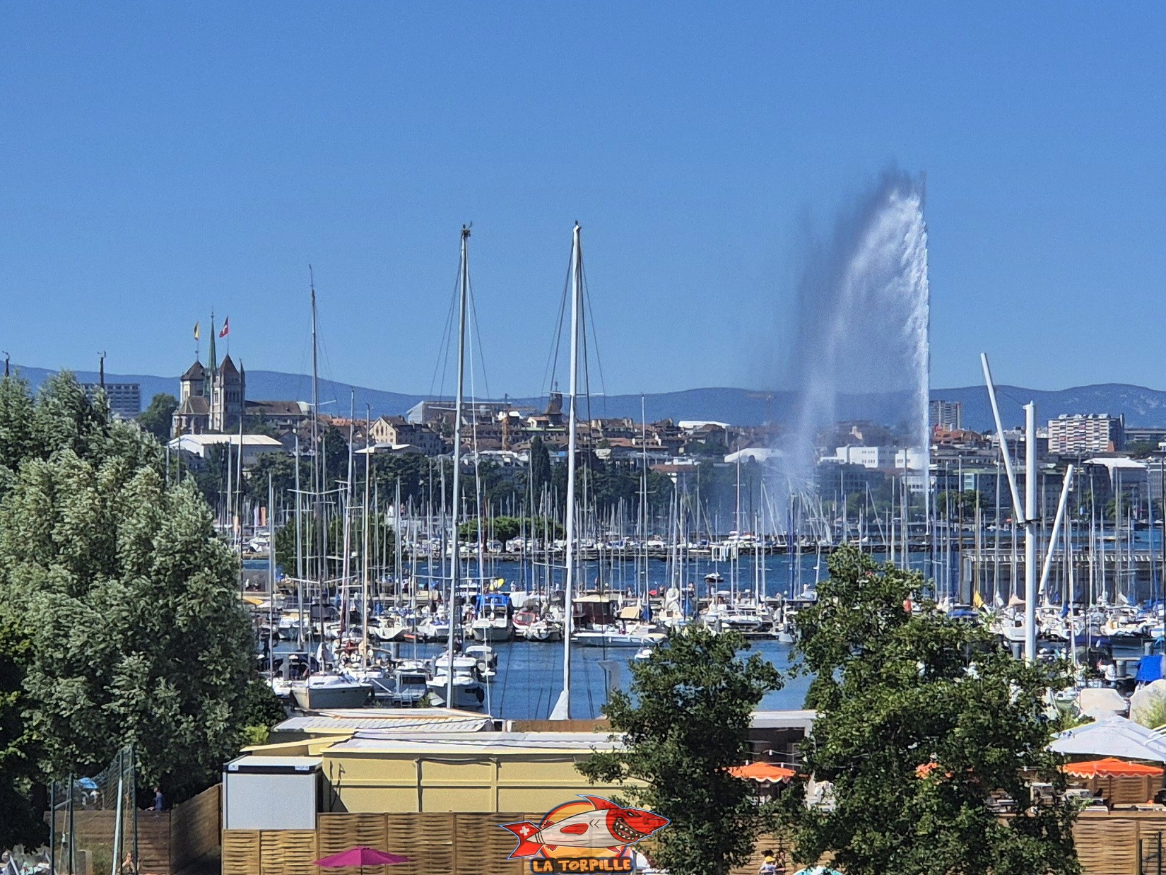 Le zoom sur la cathédrale St-Pierre et le Jet d'Eau de Genève. Sommet du plongeoir, Genève-Plage, Cologny. Lac Léman.