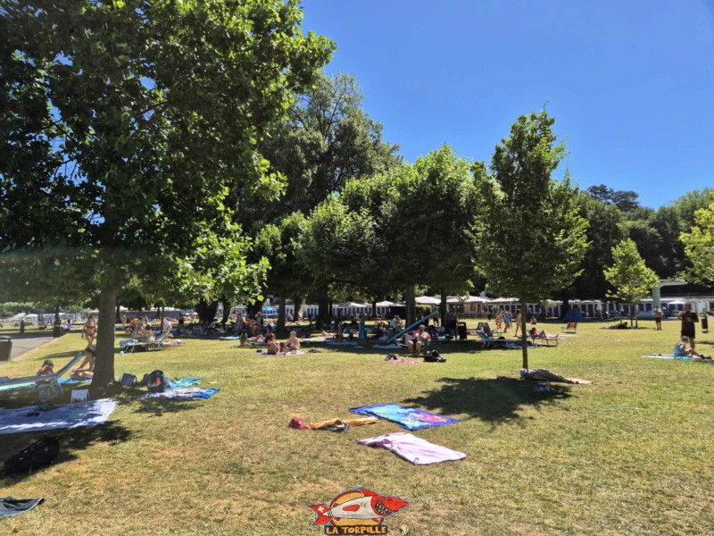 Un grand parking souterrain se trouve juste à côté de Genève-Plage.. Genève-Plage, Cologny. Lac Léman.