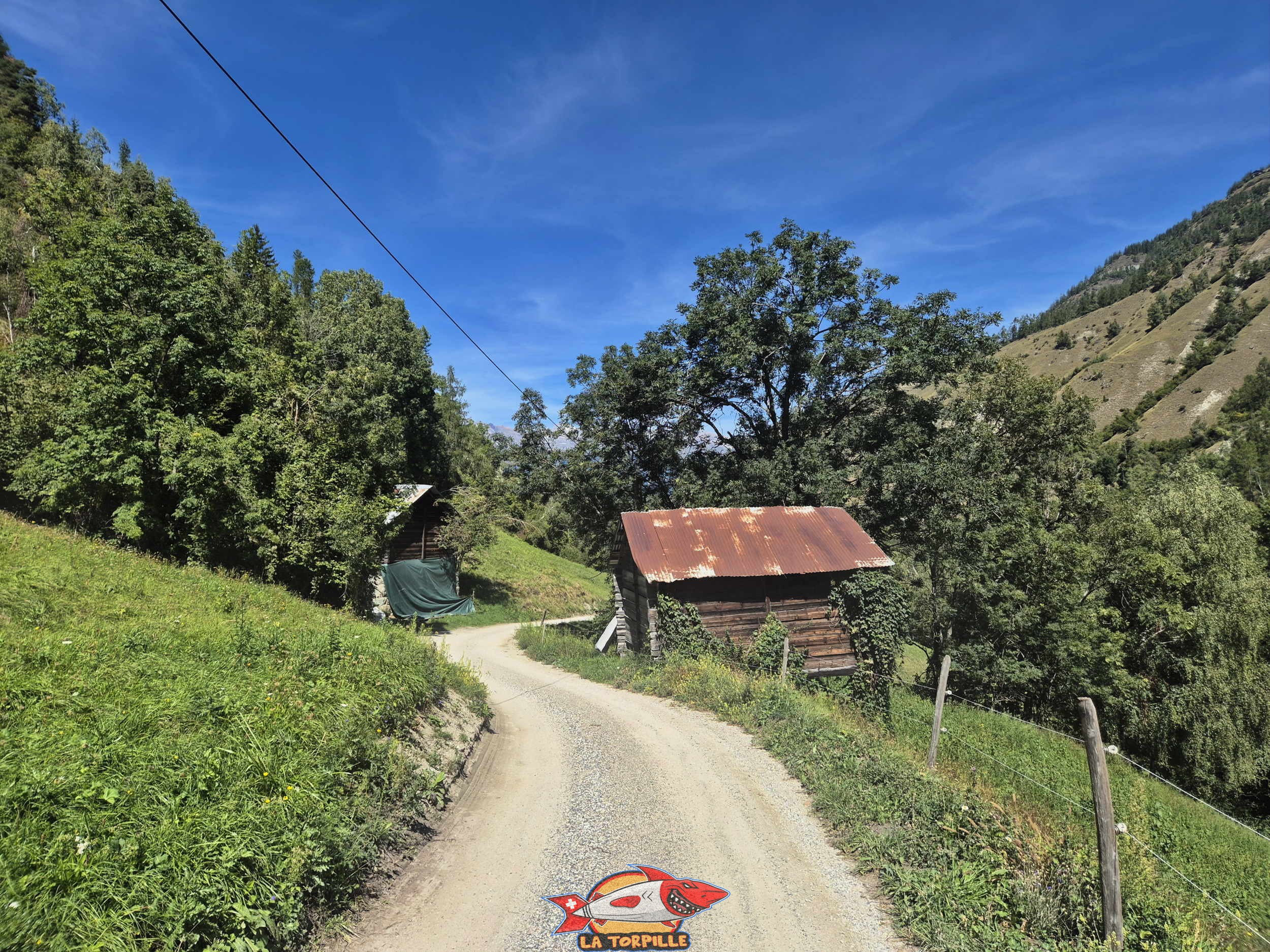 On suit ensuite une route goudronnée puis un chemin en terre en forte descente jusqu’au lit de la Borgne après avoir traversé un petit pont sur la Dixence.