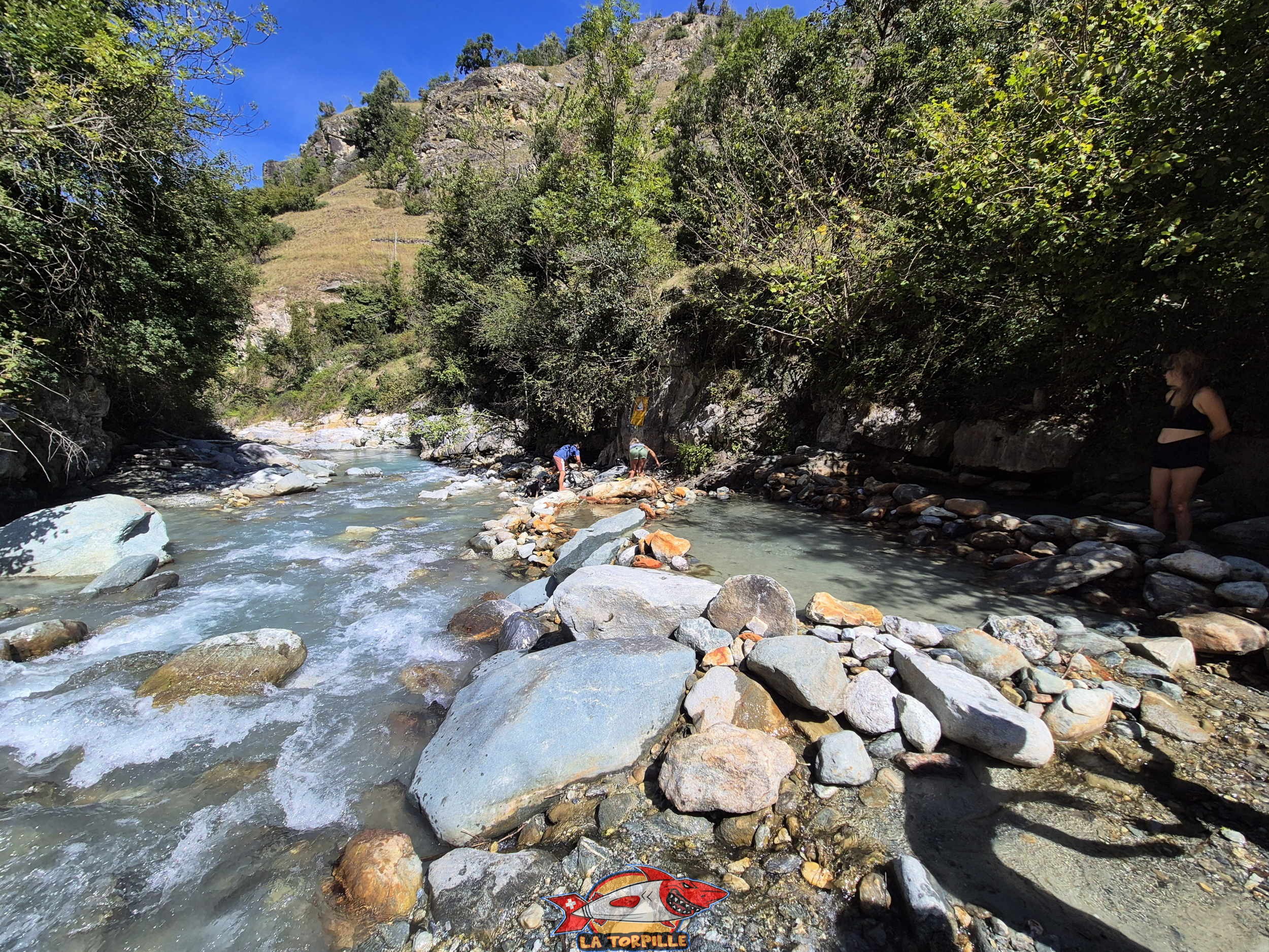 Les petits bassins d’eau chaude à côté de l’eau froide de la Borgne.