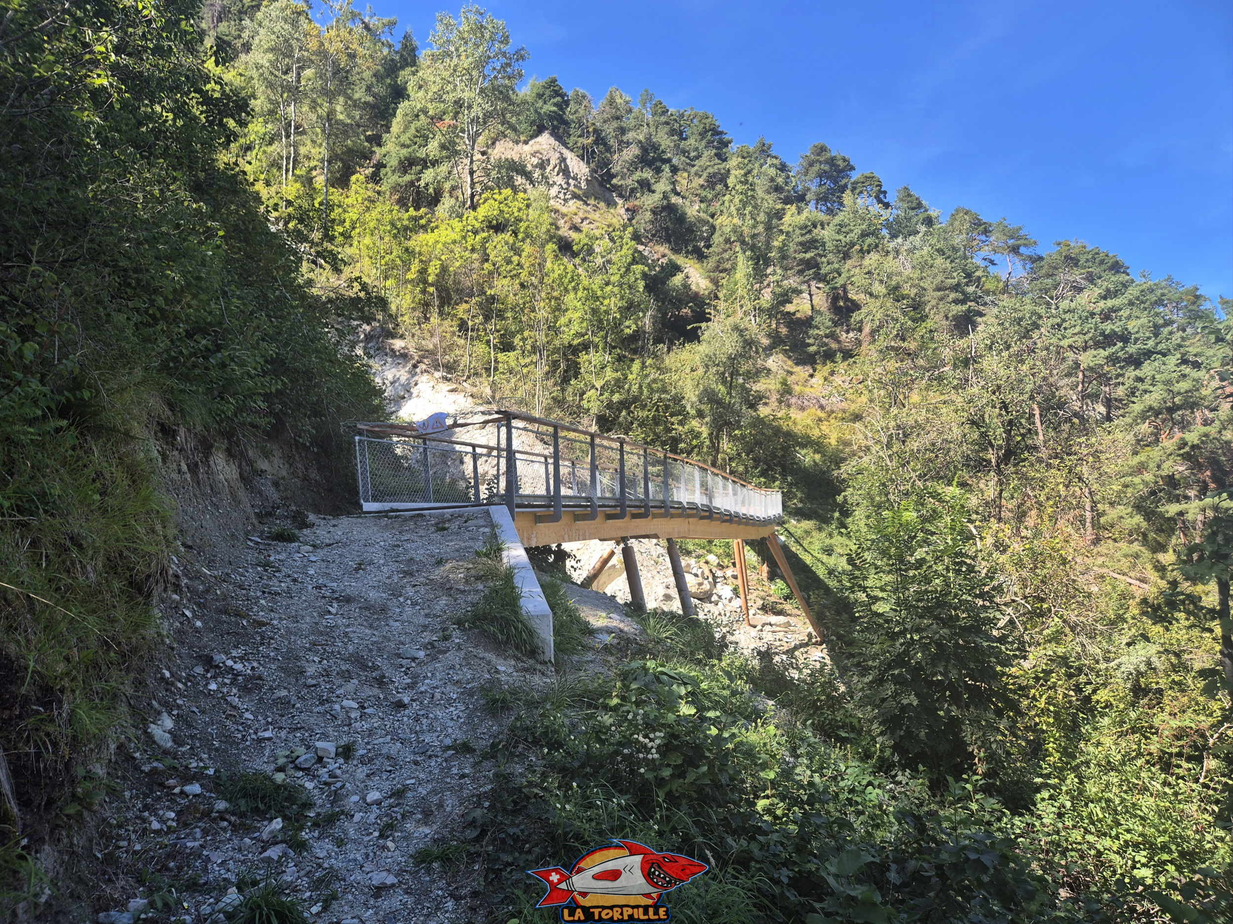 La passerelle sur la Borgne pour rejoindre le lit de la rivière.