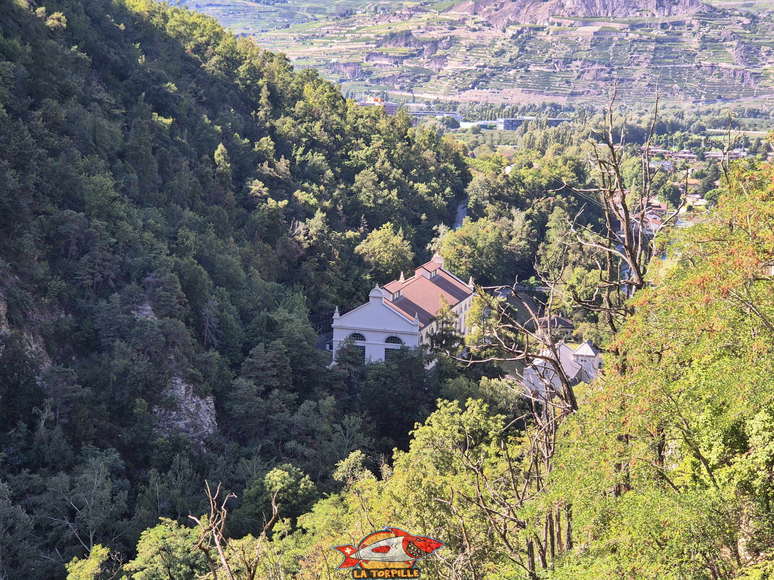 La vue vers l’arrière en direction des gorges de la Borgne. La centrale électrique de Bramois sur la droite.