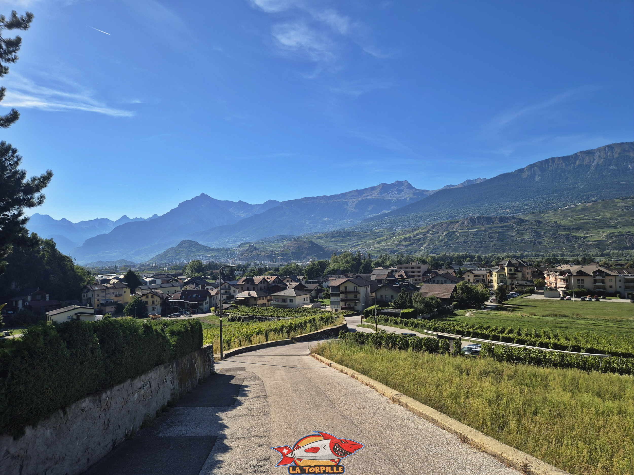 La vue depuis le cas postal au début de la montée du val d’Hérens. La ville de Sion et ses deux fameuses collines : Valère et Tourbillon (à droite).