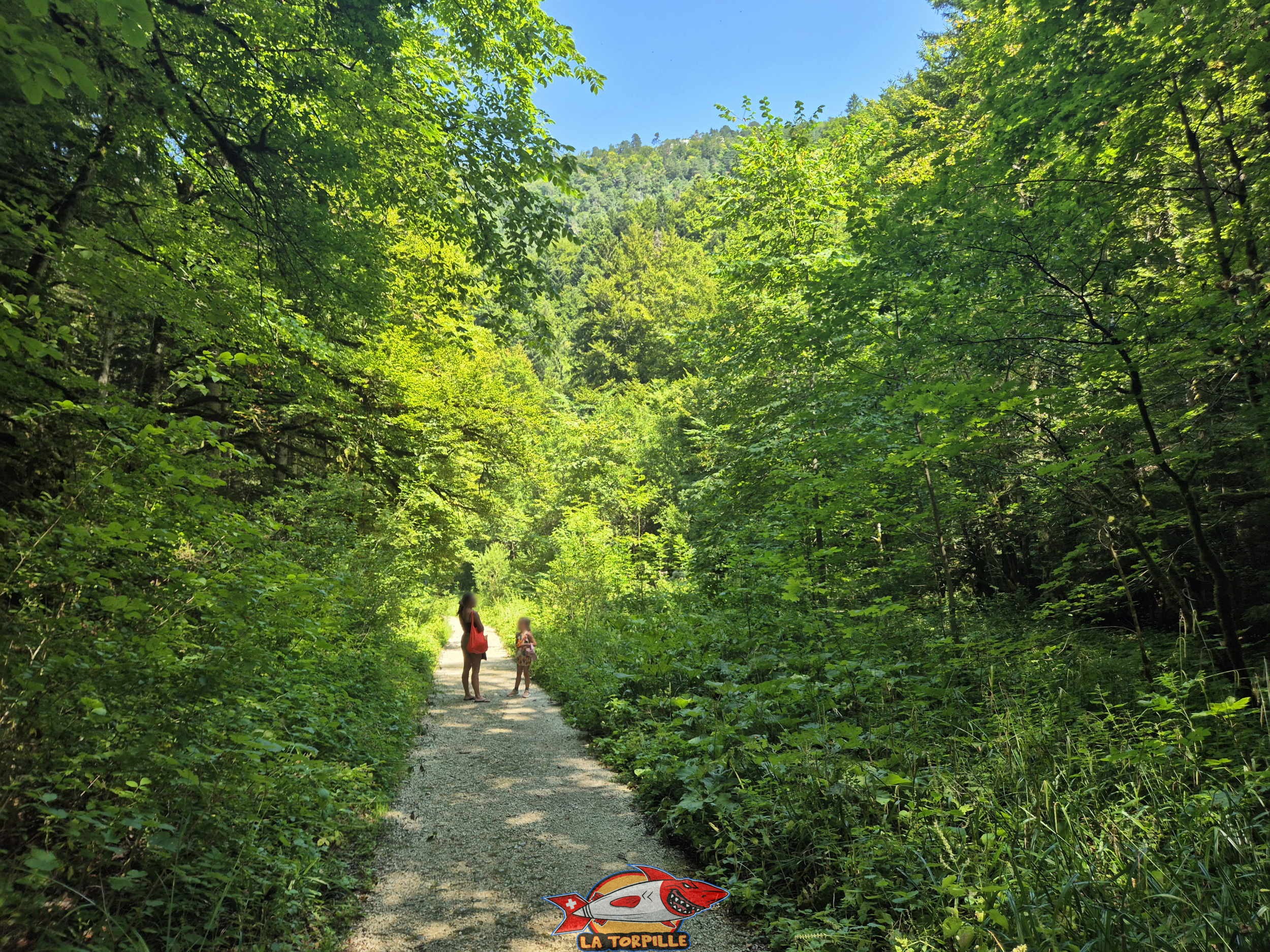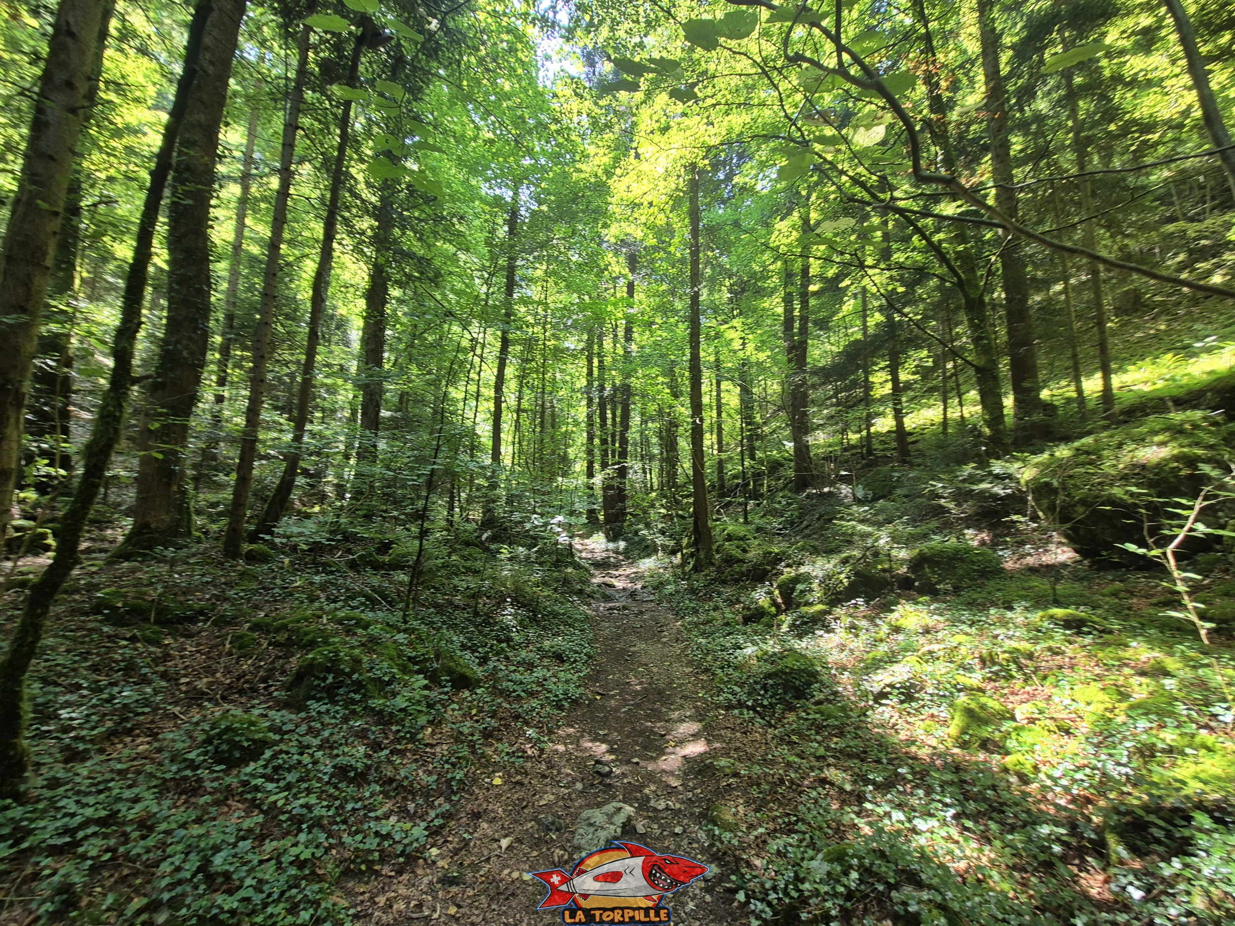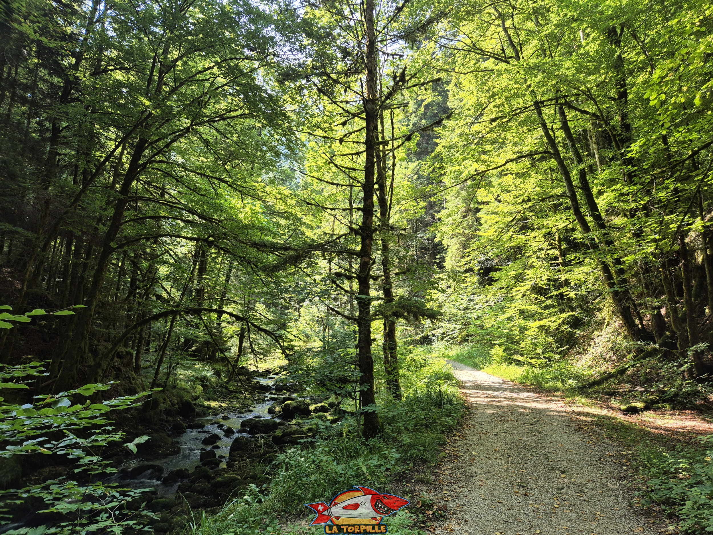 La première partie du chemin remonte le cours de la Sorne dans la forêt.