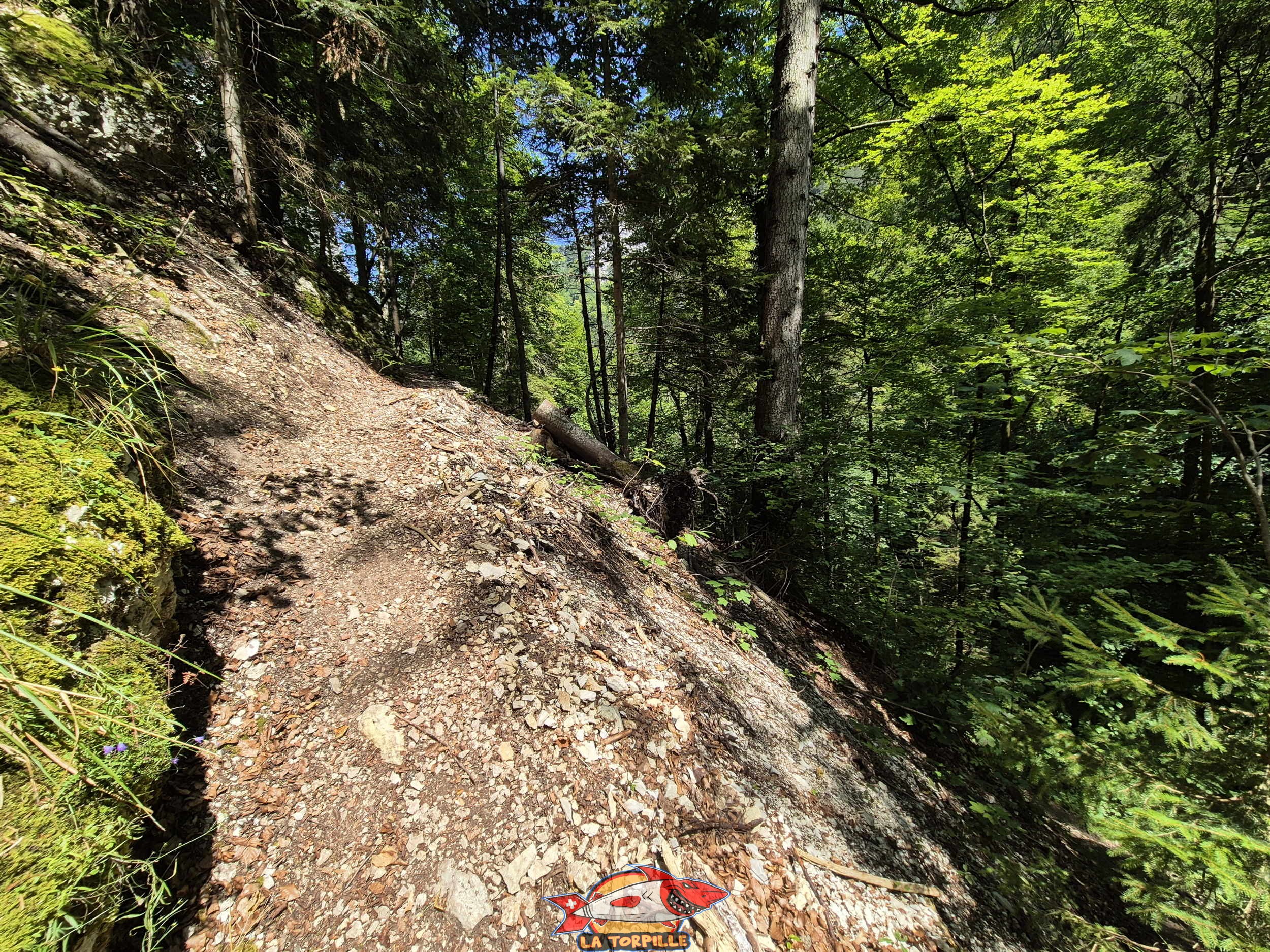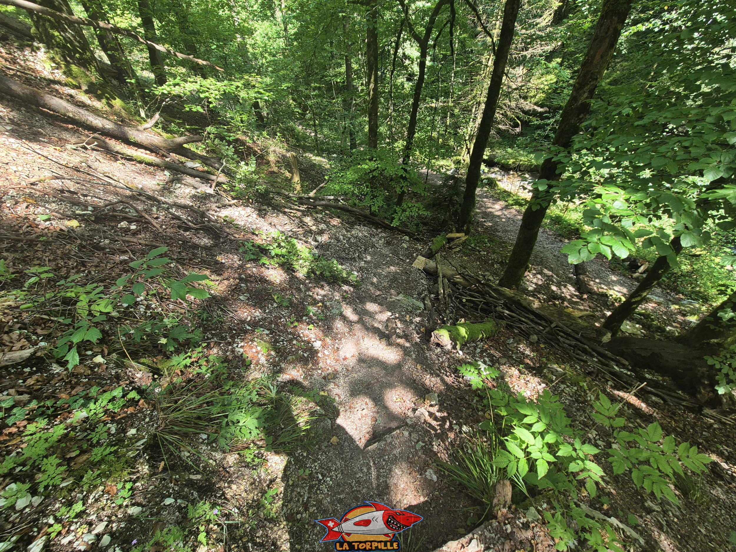 ⚠️ Le chemin qui grimpe en très forte pente depuis le lit de la Sorne jusqu’au tunnel de la route des gorges.