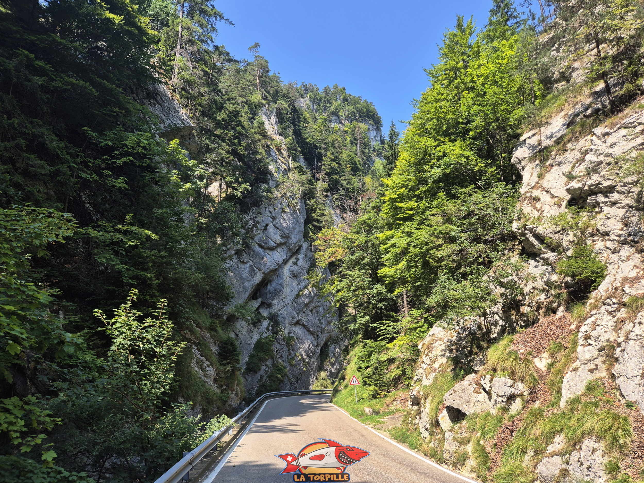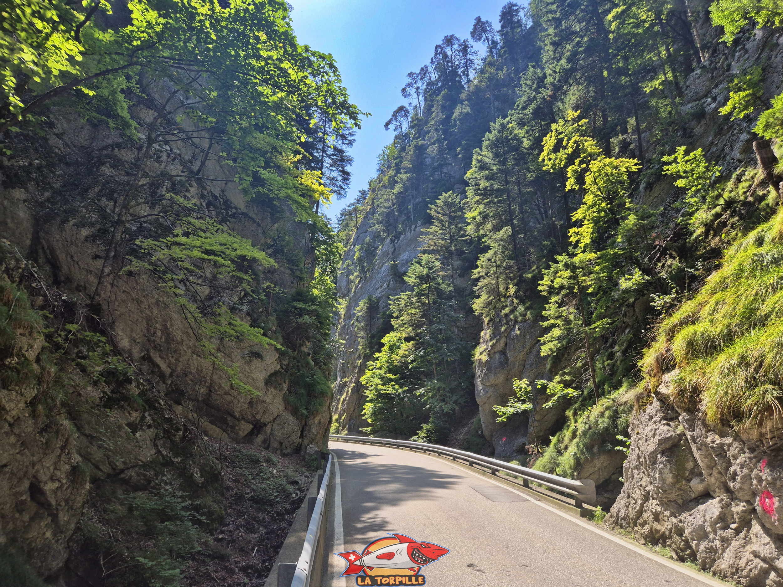La descente, le long de la route, du sommet des gorges du Pichoux jusqu’au tunnel.