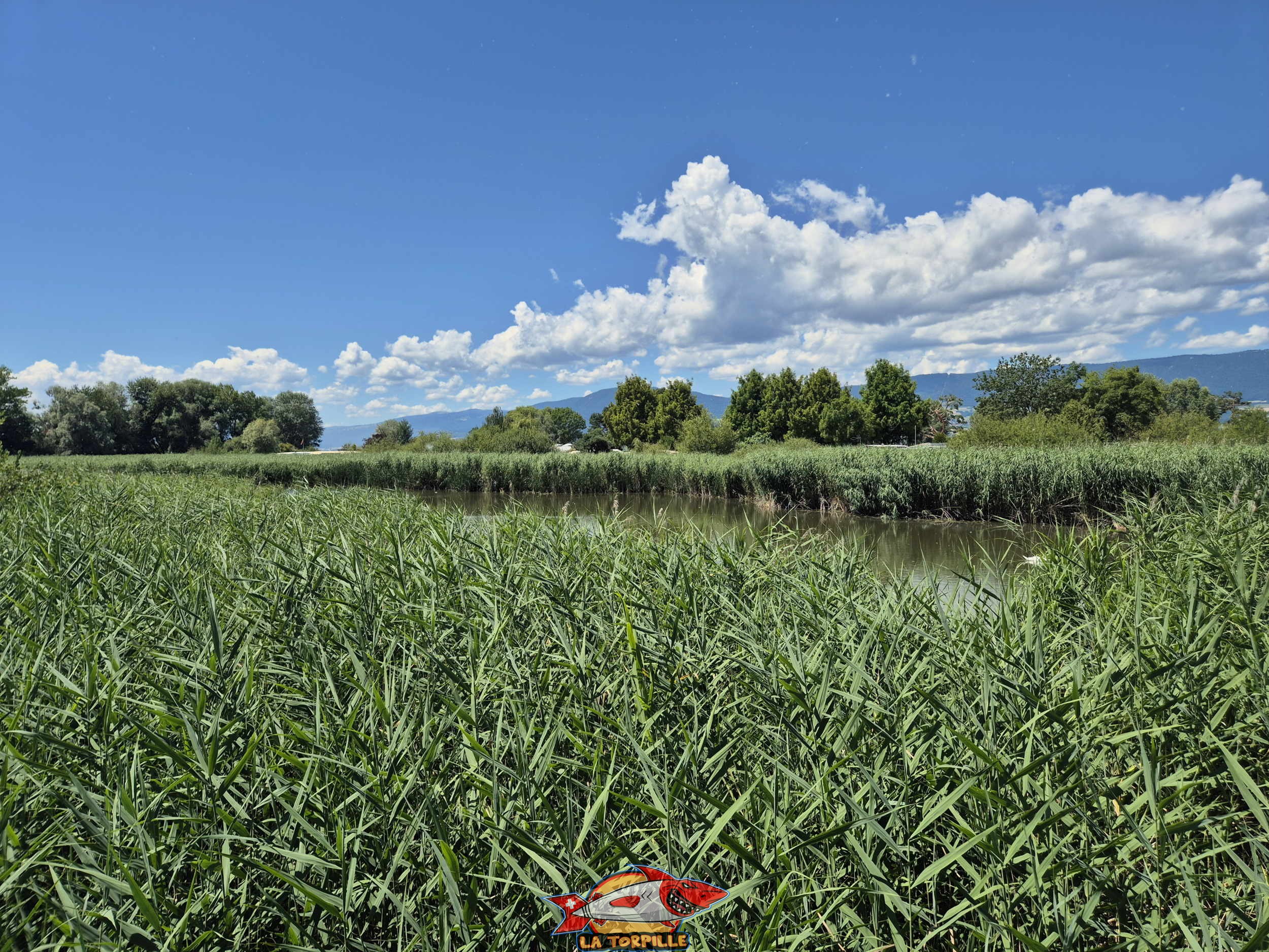 L’étang de la Grand Gouille entouré de roseaux depuis le poste d’observation. La chaine du Jura en arrière-plan.