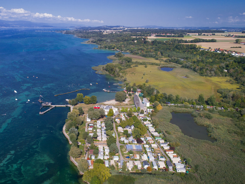 Quelques vues du ciel sur la Grande Gouille. On peut apercevoir la nouvelle plage et le camping d’Estavayer-le-Lac.