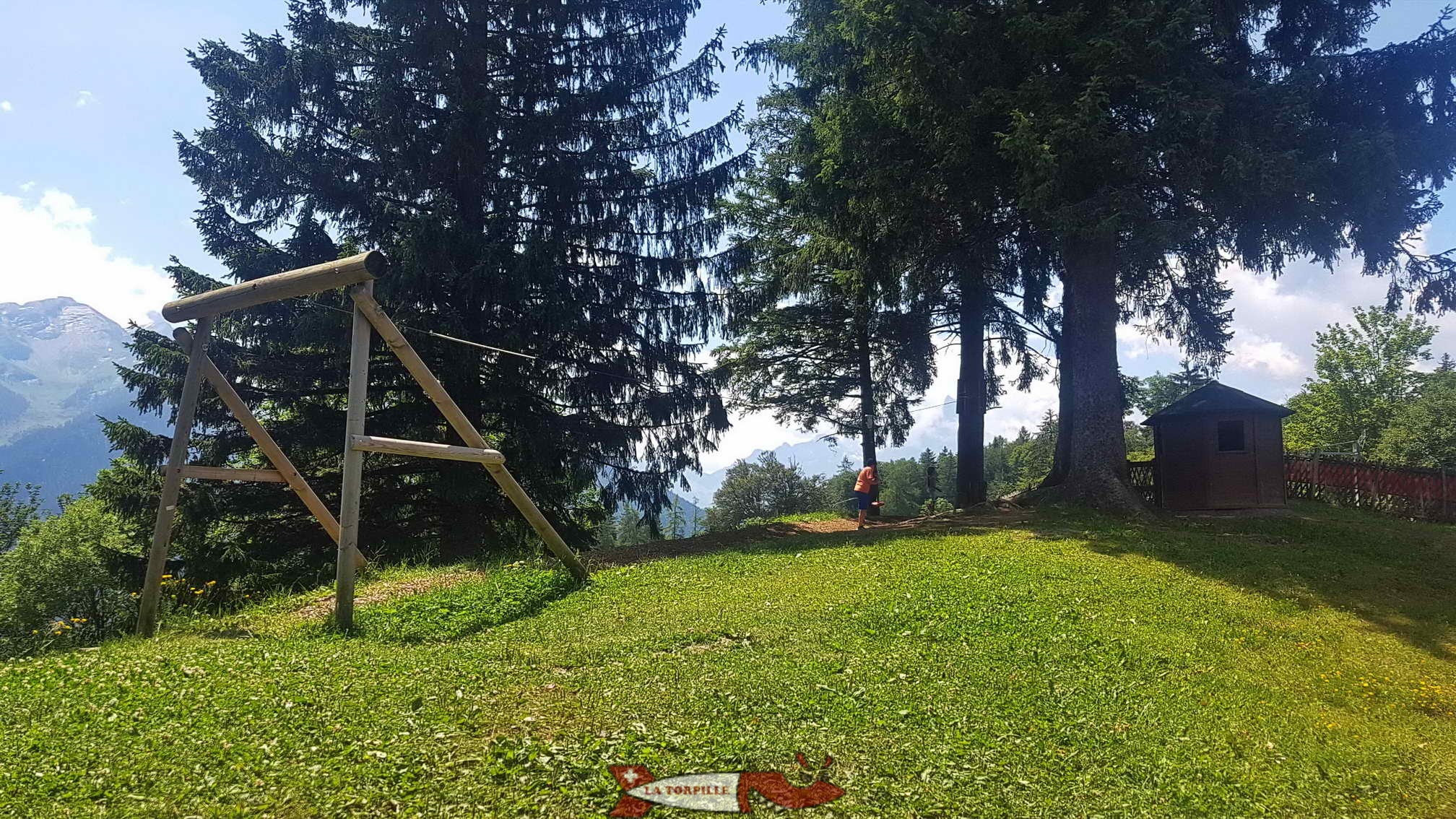 La vue d’ensemble sur Gryon Parc depuis l’ouest. Des sculptures en bois d’animaux parsèment le parc.
