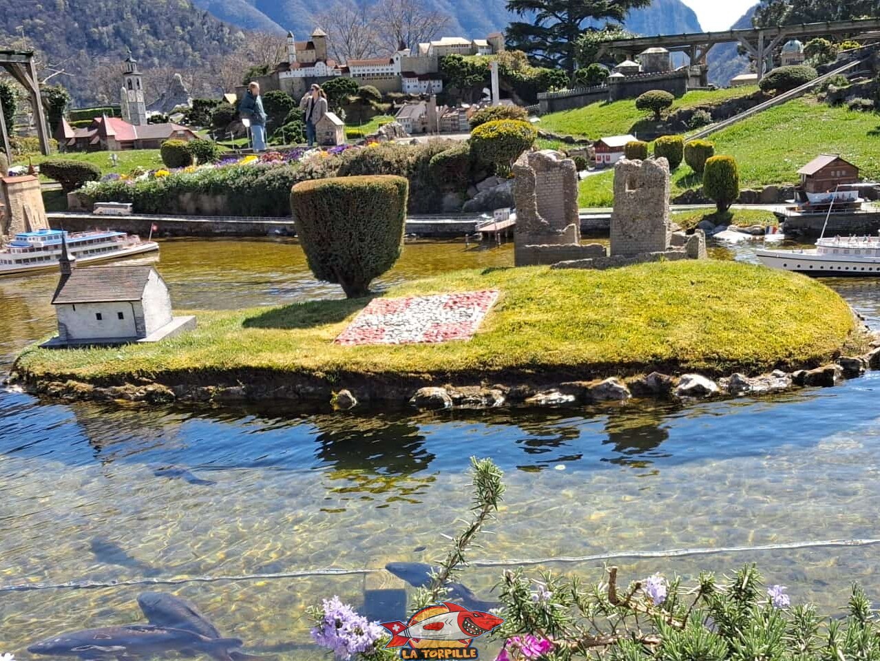La chapelle St-Théodule, l'île et les châteaux d'Ogoz au Swissminiatur de Melide, près de Lugano, dans le canton du Tessin.