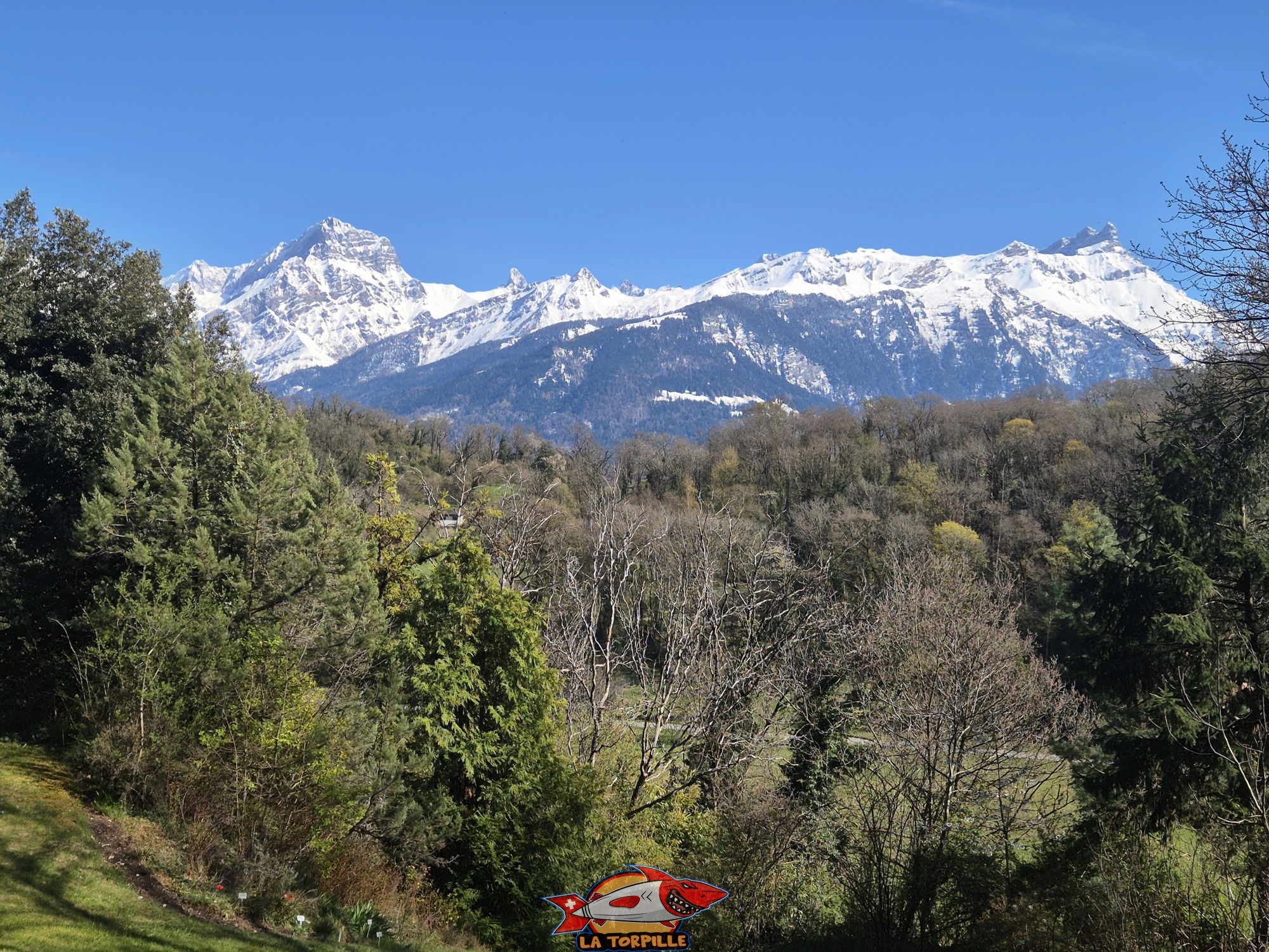 Le Grand Muveran (gauche) et les Dents de Morcles (droite), depuis le Jardin botanique.