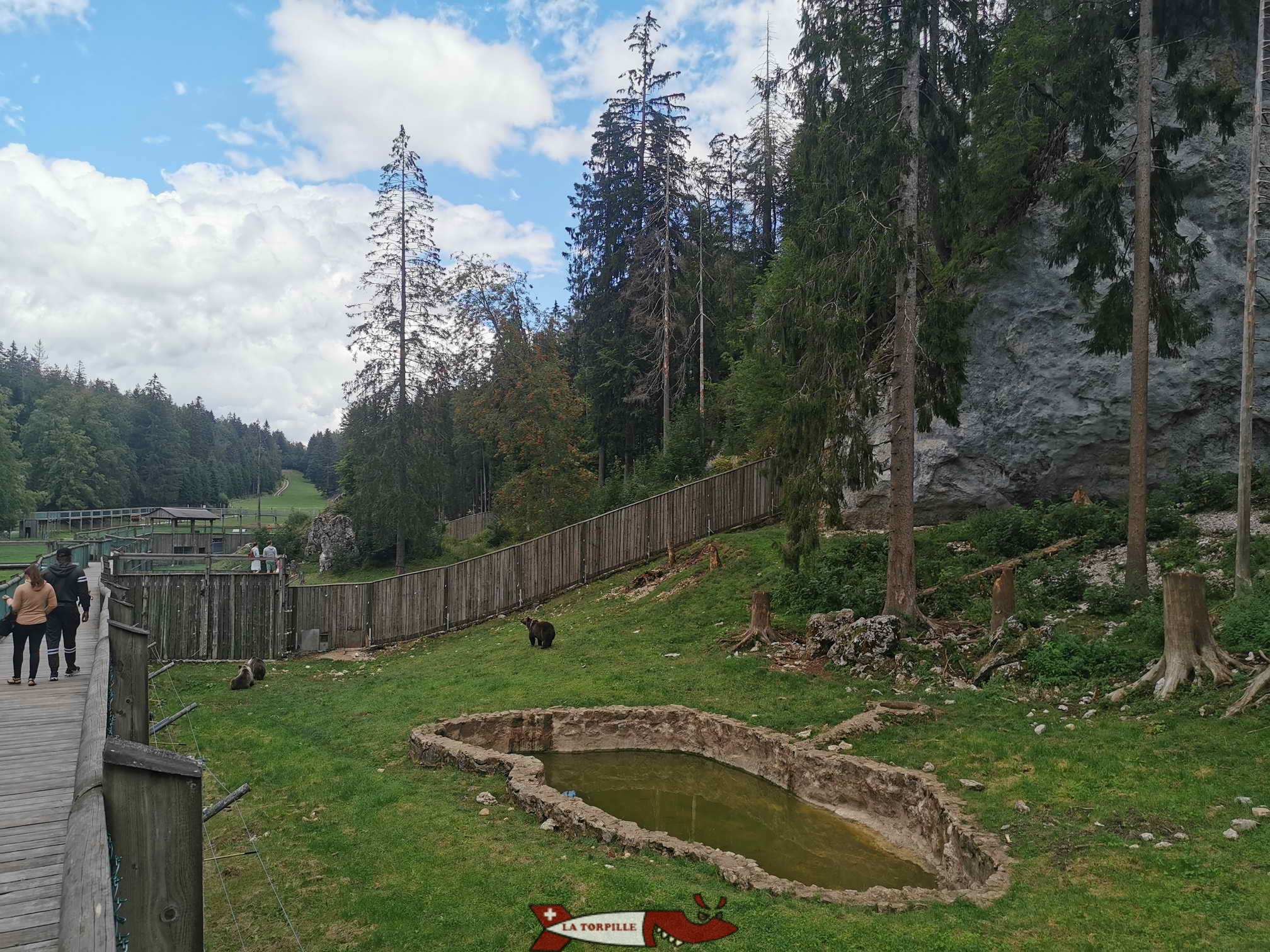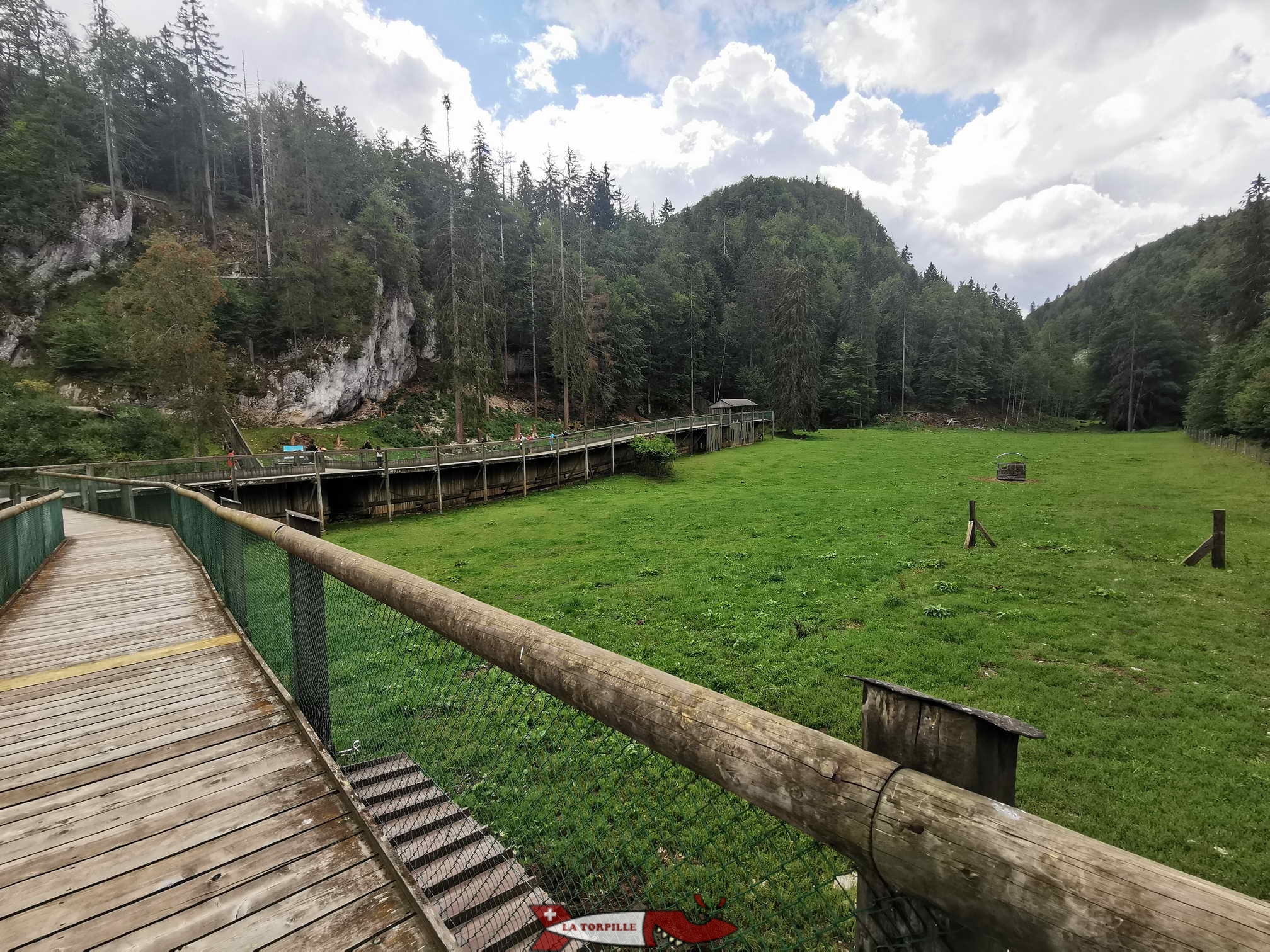 La passerelle “est” longe les parcs aux loups et ours direction est et le parc aux bisons direction ouest.
