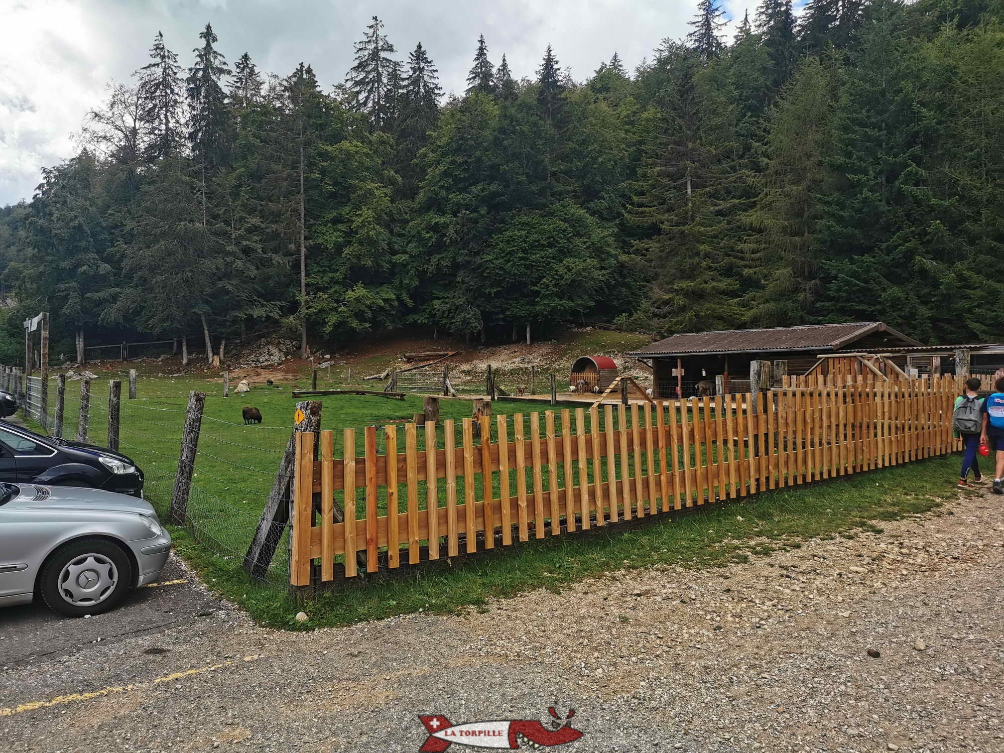 Un enclos, de l’autre côté de route par rapport à la buvette, ravira les petits enfants en leur permettant de caresser les animaux suivants :