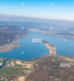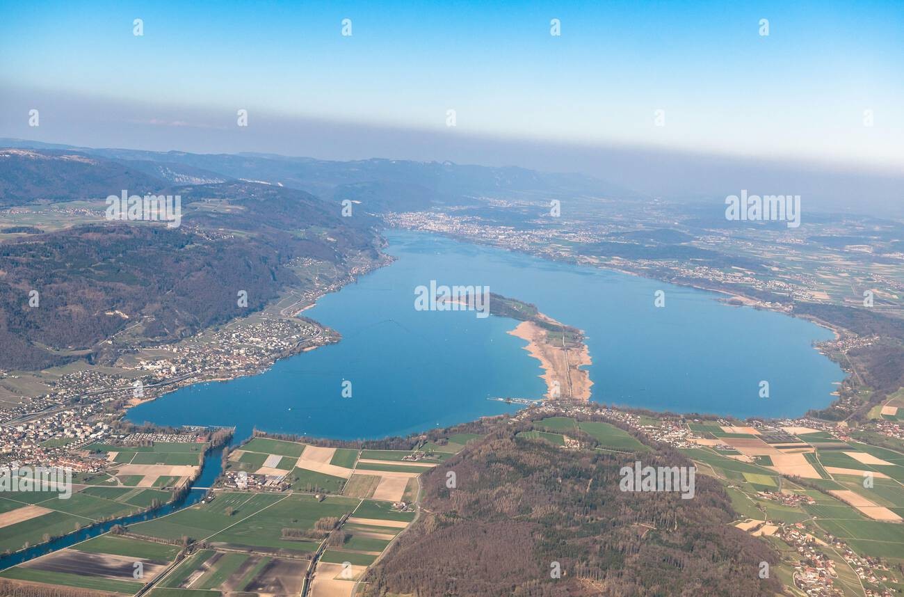 Vue sur le lac de Bienne depuis le côté Neuchâtel. Au milieu, la presqu’île St-Pierre. Au premier plan, à gauche, Le Landeron (NE) et la Neuveville (BE). Au milieu, tout au fond, la ville de Bienne. Photo : Alamy